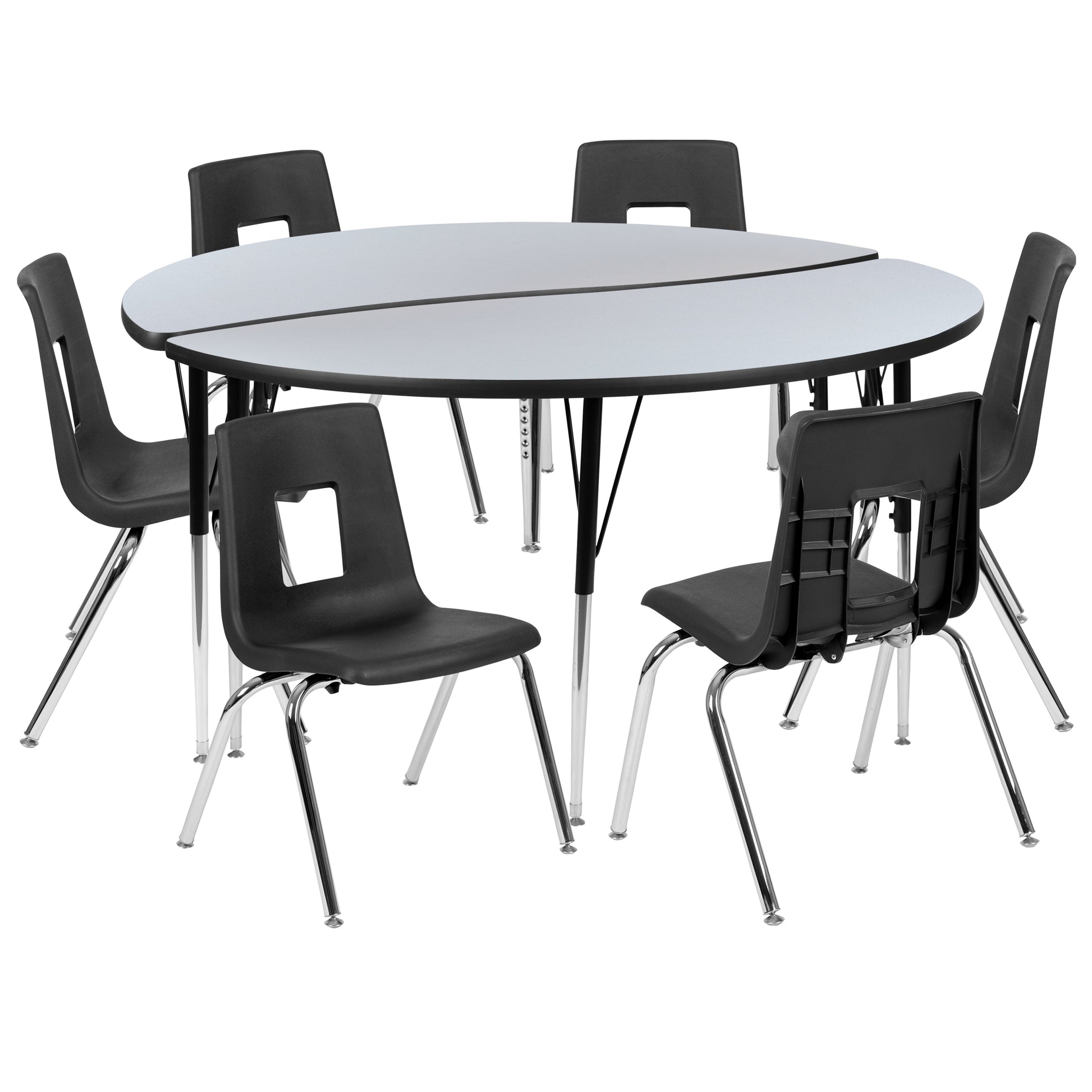 Emmy 60" Circle Wave Flexible Laminate Activity Table Set with 16" Student Stack Chairs, Grey/Black Dimensions: 60"W x 60"D x 21.25" - 30.25"H