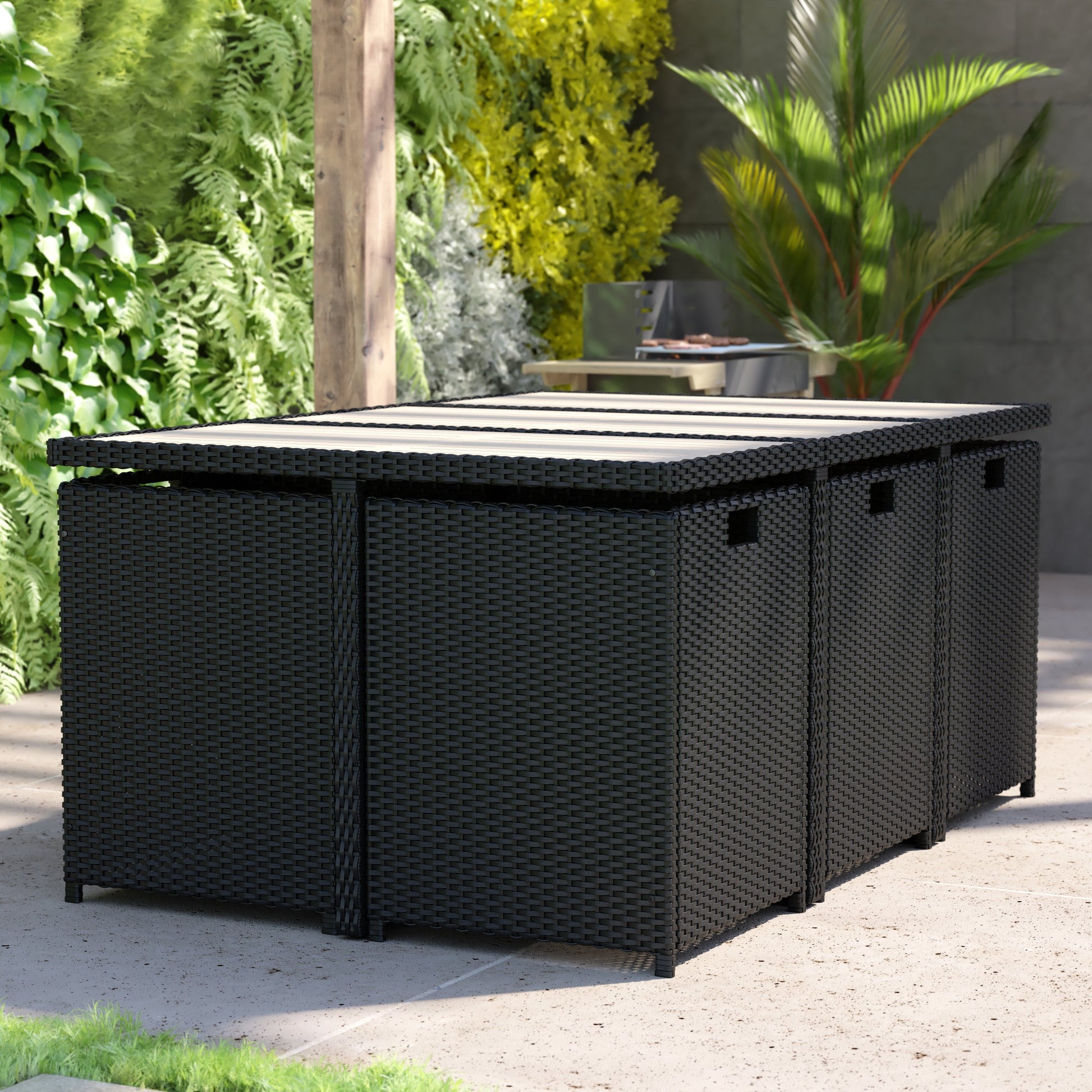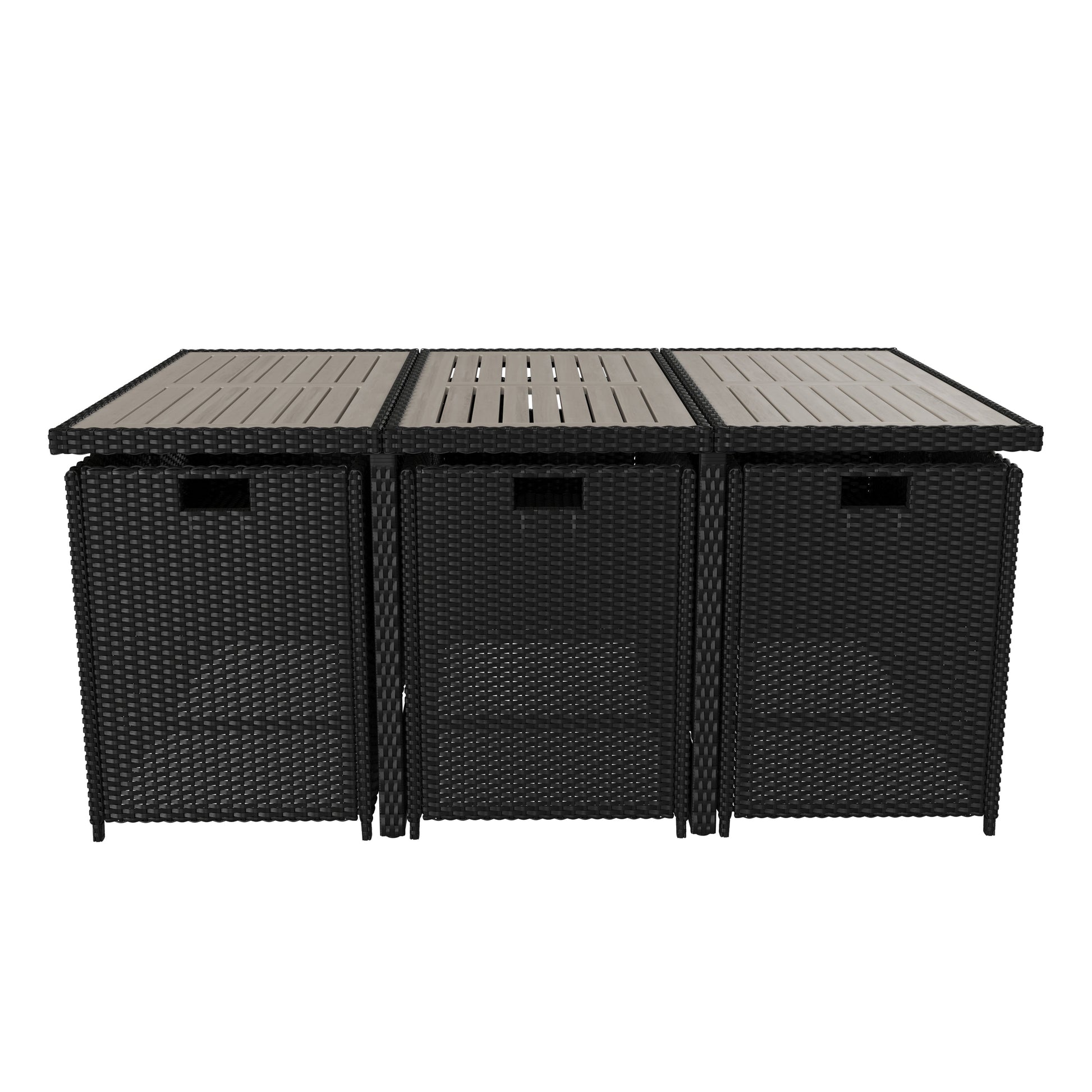 Peregrine 7 Piece Outdoor Patio Dining Set, Space Saving Black Wicker Modular Chairs-Cream Cushions & Gray Acacia Wood Table Top Dimensions: 43.25"W x 66"D x 29.5"H