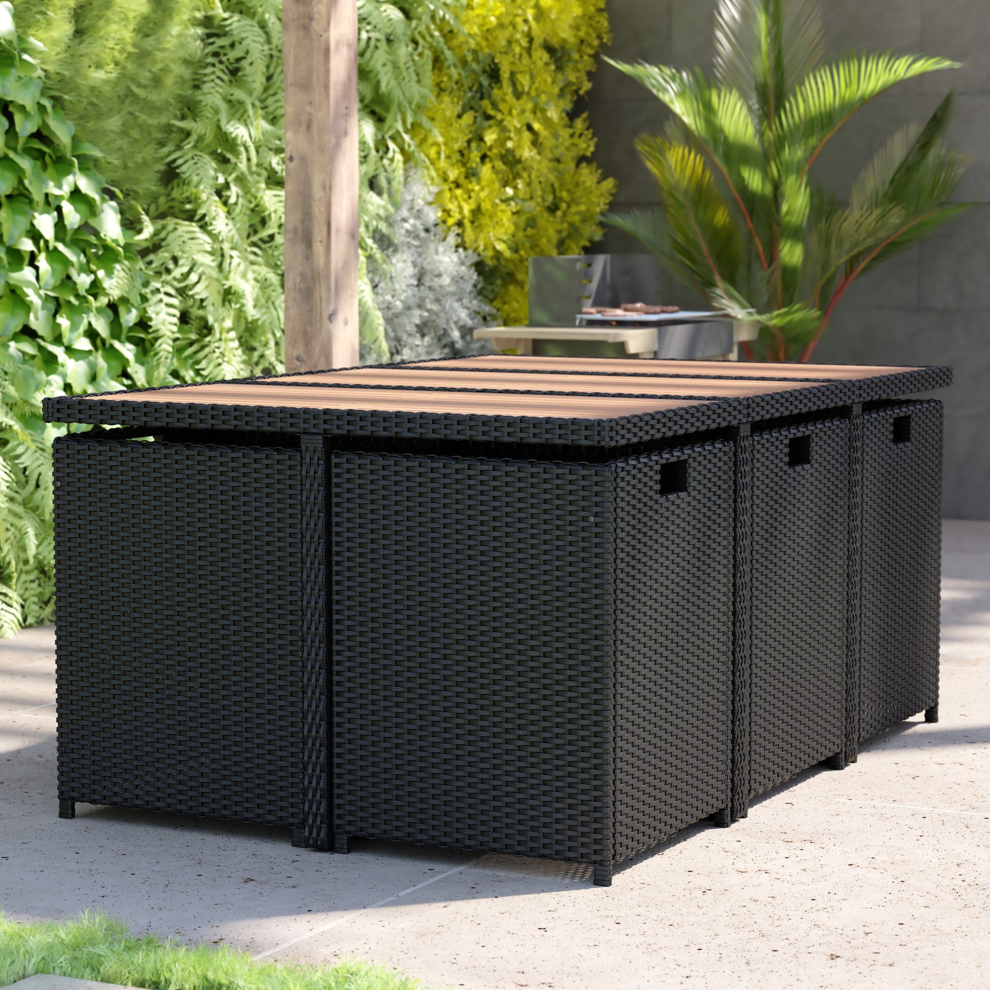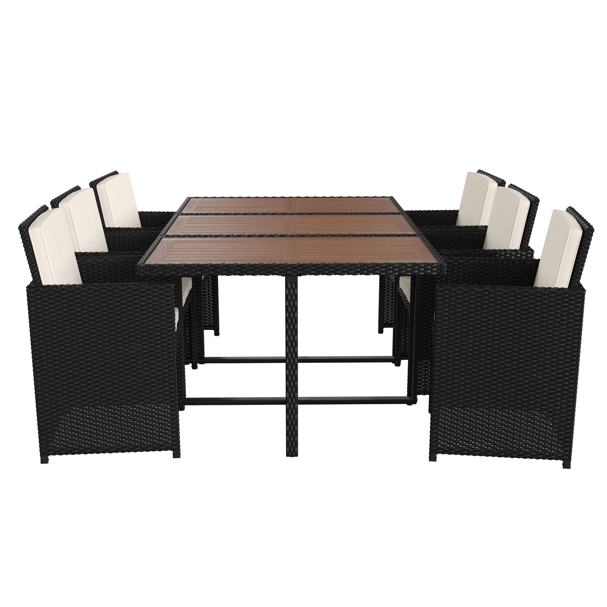 Peregrine 7 Piece Outdoor Patio Dining Set, Space Saving Black Wicker Modular Chairs-Cream Cushions & Natural Acacia Wood Table Top Dimensions: 43.25"W x 66"D x 29.5"H