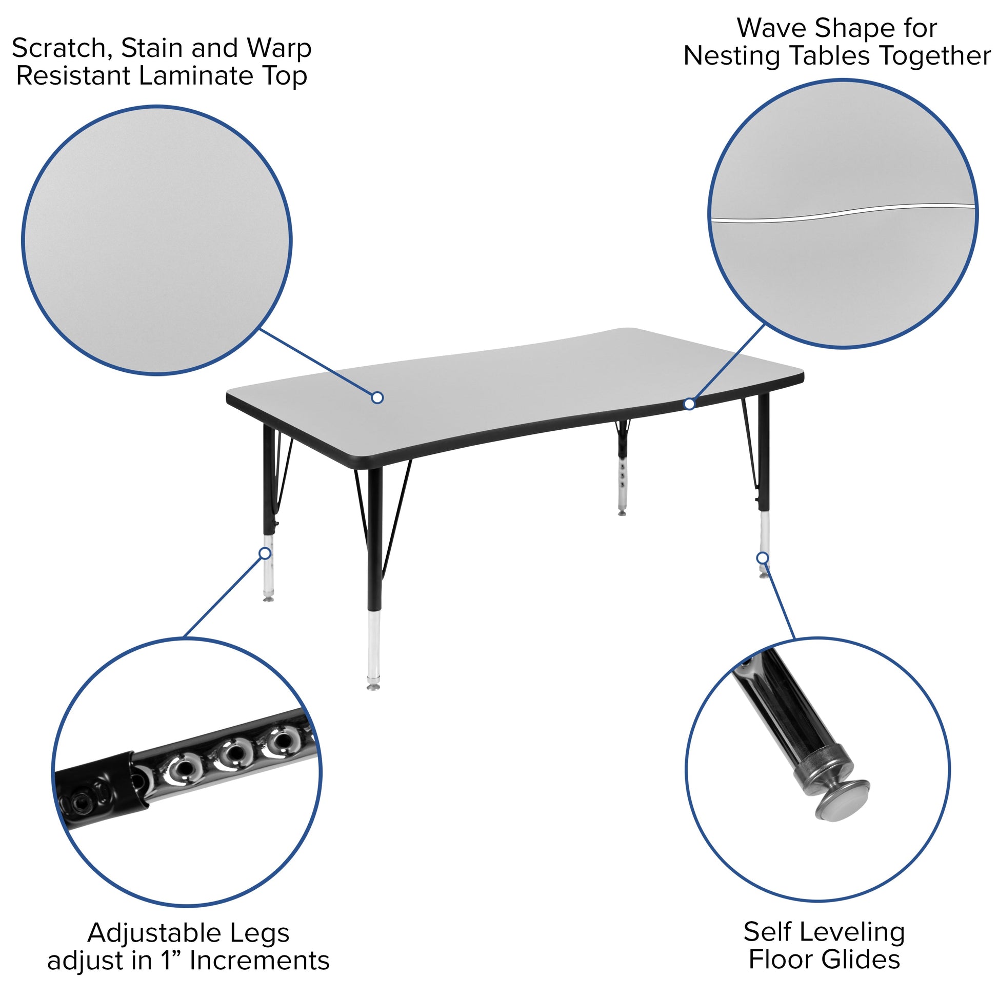 Emmy 76" Oval Wave Flexible Laminate Activity Table Set with 14" Student Stack Chairs, Grey/Black Dimensions: 47.5"W x 76"D x 16.25" - 25.25"H