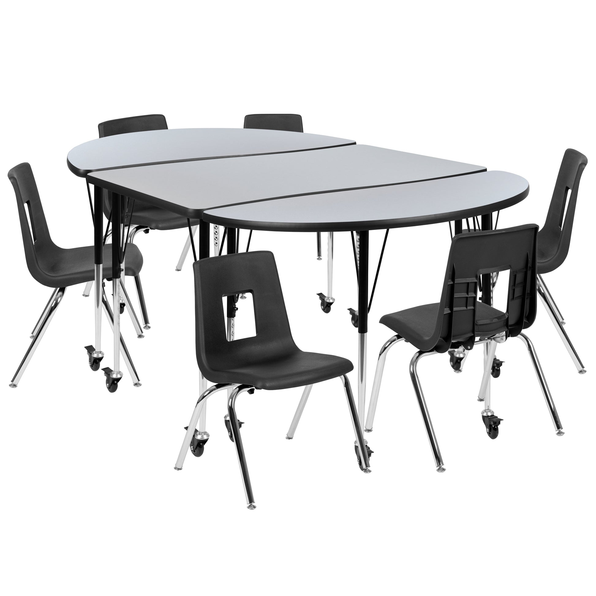 Emmy Mobile 76" Oval Wave Flexible Laminate Activity Table Set with 16" Student Stack Chairs, Grey/Black Dimensions: 47.5"W x 76"D x 22" - 30"H