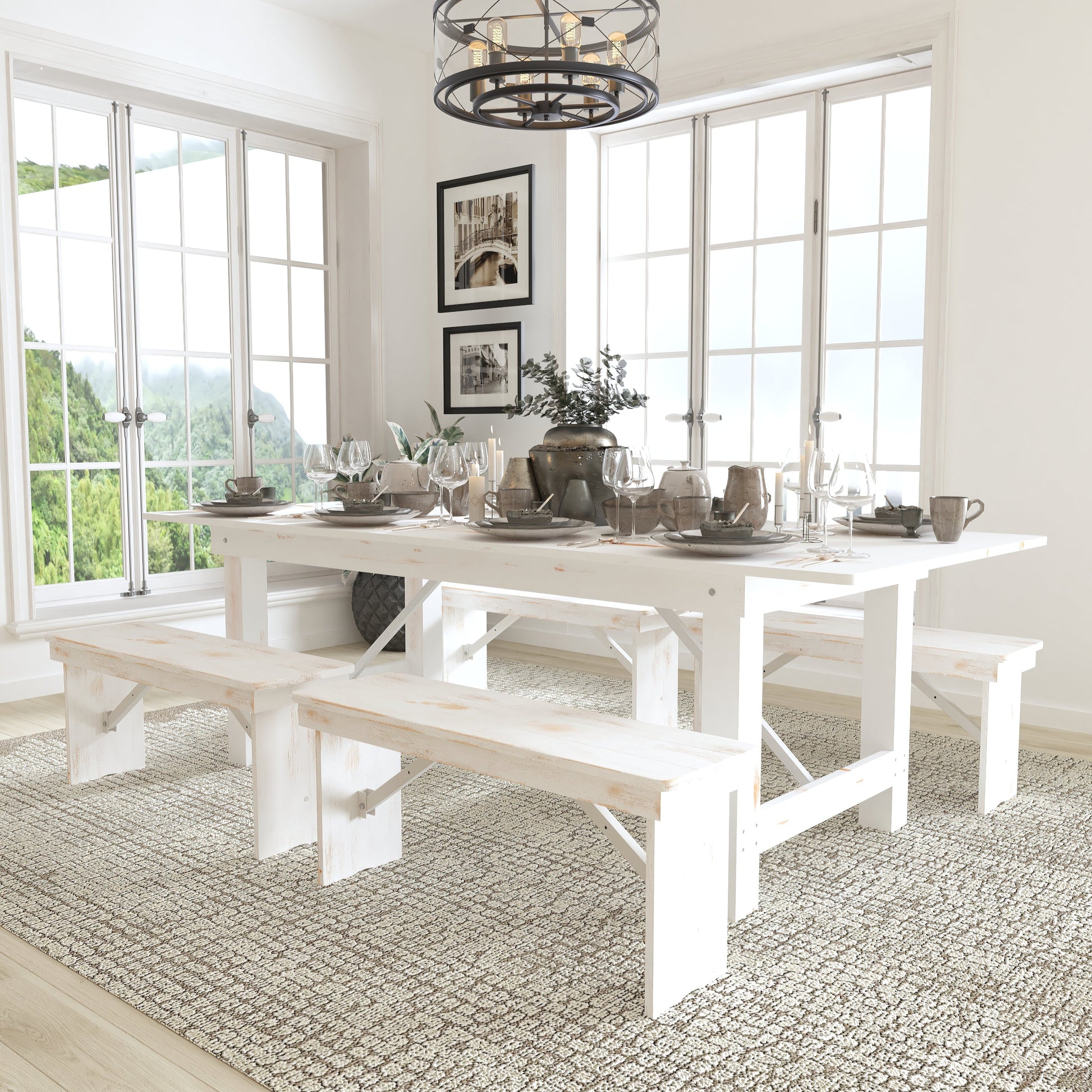 HERCULES Series 8' x 40" Antique Rustic White Folding Farm Table and Four 40.25"L Bench Set Dimensions: 40"W x 96"D x 29.75"H