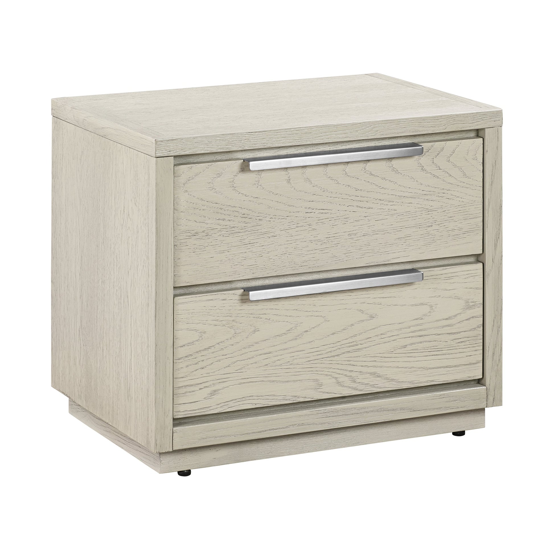 Give a functional and stylish upgrade to your room with our Abbey 2 drawer nightstand in gray oak. Clean-lined and minimal, our side table effortlessly flows into any modern space. The table elevates its surrounding with a beautiful blend of natural oak and a sleek silver-gray finish. Completed with streamlined stainless-steel handles, the nightstand serves as a modern and sleek addition. The Abbey nightstand can be used in multiple settings. This can be used traditionally as a bedroom nightstand, provide extra surface space as an end table, or maximize storage in your home office. It features 2 spacious drawers to keep all your essentials within reach but out of sight. Oak is a highly durable hardwood used for thousands of years. It has a unique grain pattern derived from the rings of the oak tree. It contains high levels of tannins, allowing the wood to resist insects, mold, and fungus naturally. Keep your bedroom tidy and organized with our elegant and practical lamp table.