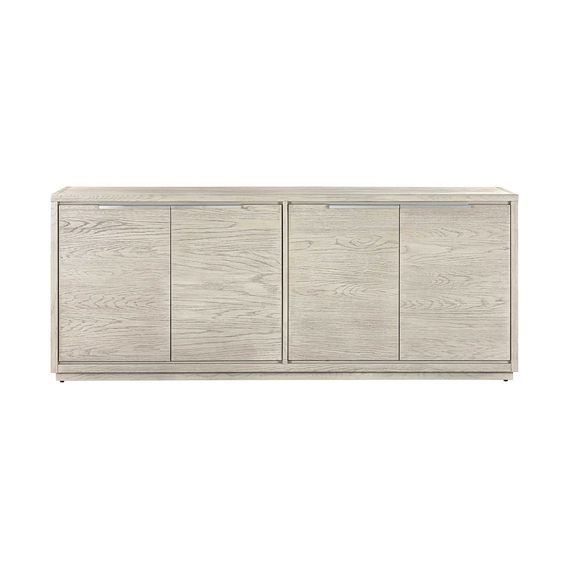 Add stylish and functional storage solution to your home with Abbey silver gray oak 4 door sideboard and buffet. The modern and streamlined look of the sideboard allows focusing on the rich organic grains of Oak. Completed with a sleek silver-gray finish, the sideboard can bring effortless style to any dead corner of your home. The Abbey features brushed stainless steel handles that complement this dining room console cabinet. With a timeless and versatile design, our 4-door sideboard can easily transition from a buffet to a media, office cabinet, or entryway storage unit. Oak is a highly durable hardwood used for thousands of years. It has a unique grain pattern derived from the rings of the oak tree. It contains high levels of tannins, allowing the wood to resist insects, mold, and fungus naturally. This serving buffet features plenty of storage with its 4 doors and shelves to become your perfect entertaining companion at brunches and holiday.