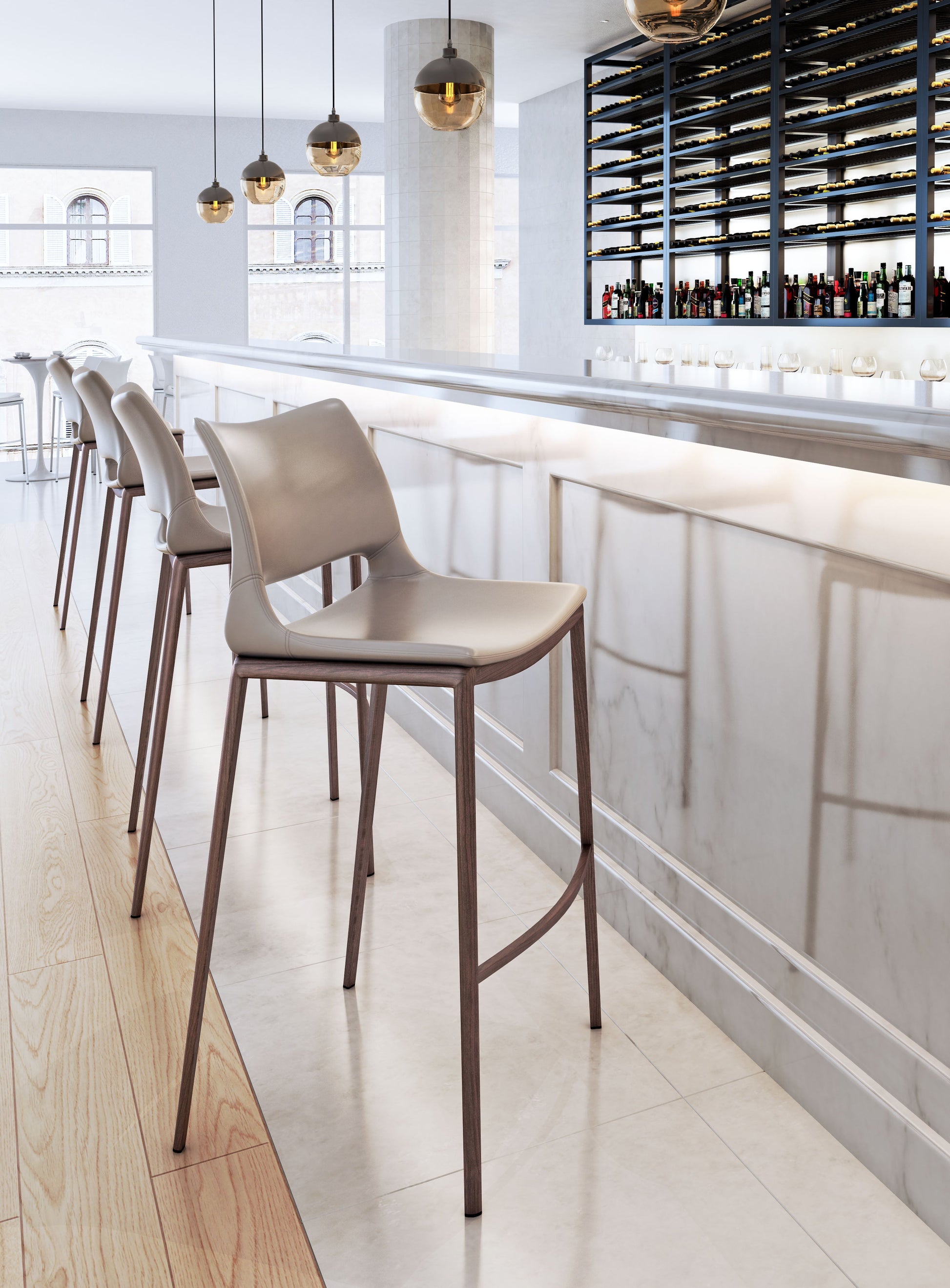 Built for comfort, this ergonomic barstool is the perfect solution for your home or office space. A Faux Wood frame in walnut brown plays a supporting role while the built-in curved footrest keeps you firmly planted. Gray faux leather seat deck is sleek and modern, making this barstool the perfect compliment to any room setting.
