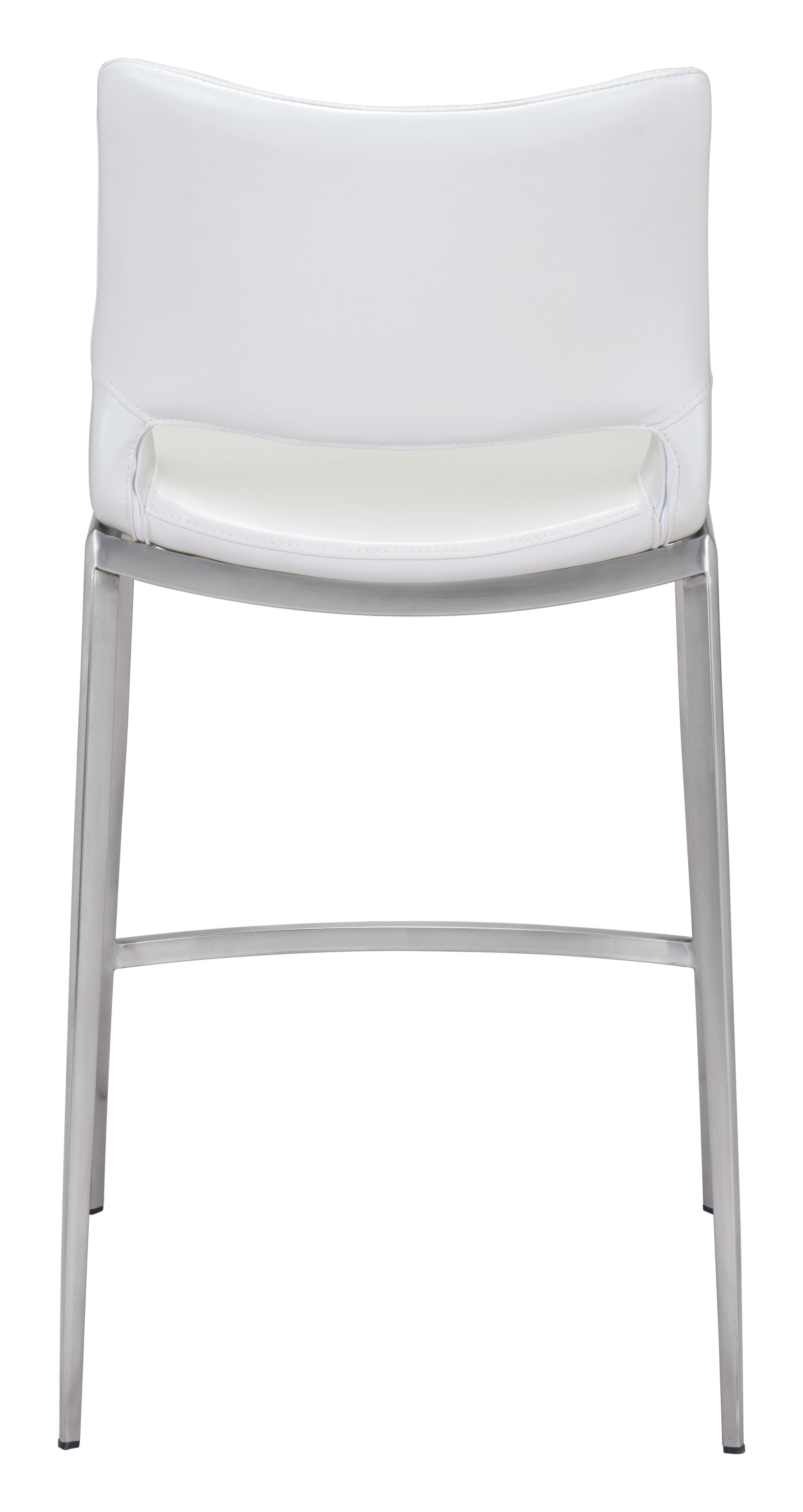 Built for comfort, this ergonomic counter stool is the perfect solution for your home or office space. A brushed Stainless Steel frame plays a supporting role while the built-in curved footrest keeps you firmly planted. White faux leather seat deck is sleek and modern, making this barstool the perfect complement to any room setting.