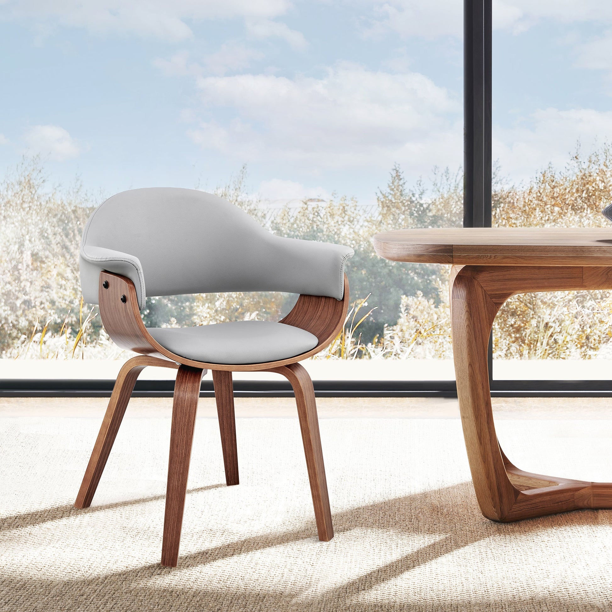 The Adalyn Gray Faux Leather and Walnut Wood Dining Room Accent Chair from Armen Living is the perfect special and spacious seating option to bring into your living space. The open-back design offers breathable seating, combined with the soft foam padded cushion - this chair will make you want to stay seated all day long. The rich fabric is alluring and authentic, looking great, and performing well is what we offer to our customers with every product. Place this chair in any room of your home to help update your decor! The Adalyn accent chair is available in your color choice of Gray, cream, or black faux leather with walnut wood or Gray faux leather with black wood. Product Dimensions: W:25 x D:19 x H:30 x SH:18