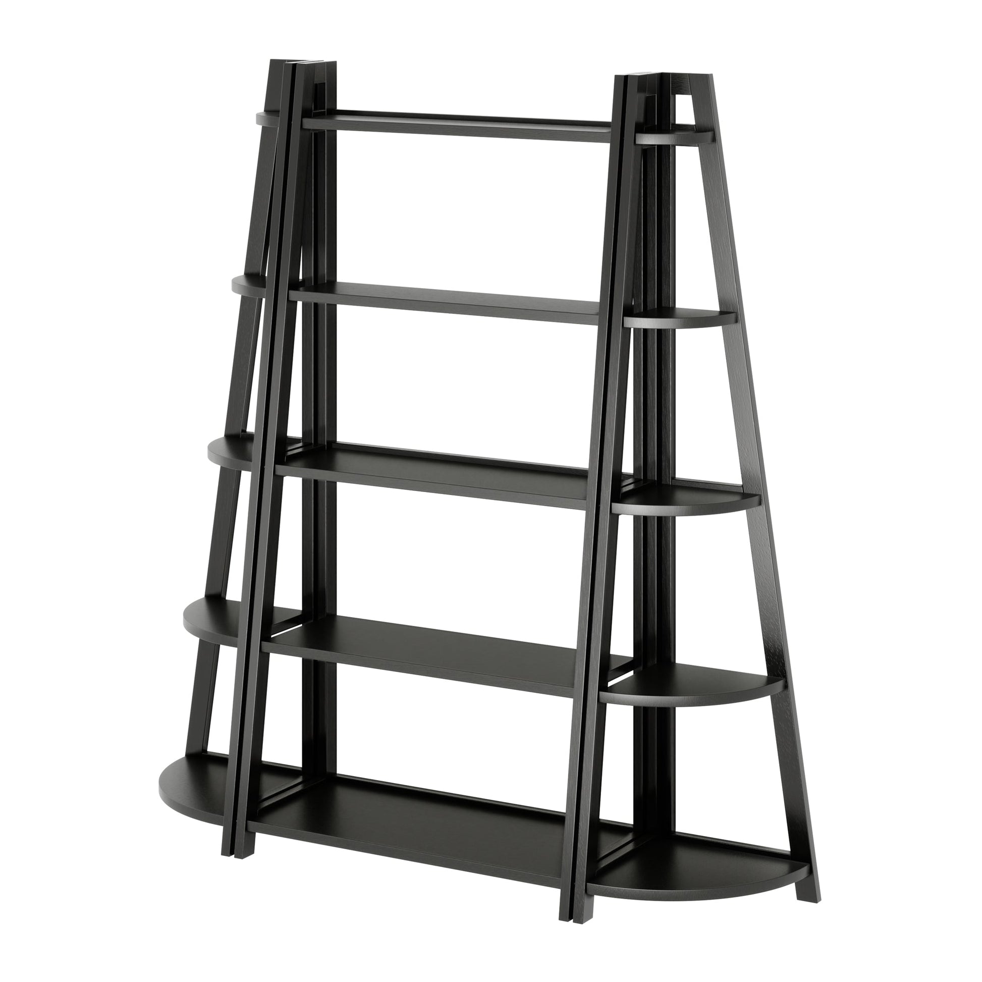 Create eye-catching, contemporary storage with the Winsome Wood Adam 3-Pc Shelving Set. This A-frame set design offers a 5-Tier Ladder Shelf which can be bookend with the two matching corner shelves for a unique shelving unit with any number of display options. The set's slim structure is ideal for apartment living or smaller spaces. All of the shelves have a 12" clearance to make stacking books, keeping them spine-out, or a combination of both suit your style. And with varying shelf width and depth, the display options for photos, collectibles, or plants are unlimited. Constructed of solid wood in a rich black finish, the set used together or separately will blend with any decor. Brighten your work space, bedroom, living room, or even your kitchen with this handsome set. Each unit is conveniently packed and shipped in its own box that includes the hardware necessary for assembly.