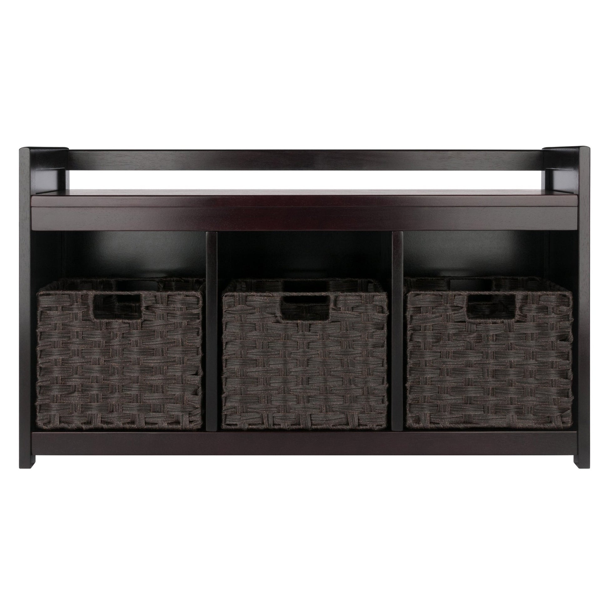 Enhance the appearance of your home with the Winsome Wood Addison 4-Piece Storage Bench Set. Beautifully crafted and multi-functional, this bench set is a perfect piece to add to any area of your home. Featuring three cubby-style openings, which are suitable for storage and organization of your home essentials such as shoes, books and more. Perfect for the living room, for displaying books or storing your go-to blankie or throw. Two panel dividers separate the storage cubbies and helps you stay organized all while helping with the structure and stability. Spacious and comfortable for sitting to take off your shoes after a long day. The set of baskets are woven in durable flat polypropylene in a chocolate finish and have two cut out handles, one on each end, for carrying purposes. Prompt up and these baskets measure 10.24”W x 11.02”D bringing charm and style. When not in use, they fold for easy storage taking up almost no space. This set is shipped in two boxes. The shelf will ship separately and will include the hardware necessary for assembly. Replacement parts can be requested directly to the manufacturer within 60 days from date of purchase.Dimensions : 37.4 in. Wide 13.5 in. Deep 20.87 in. High