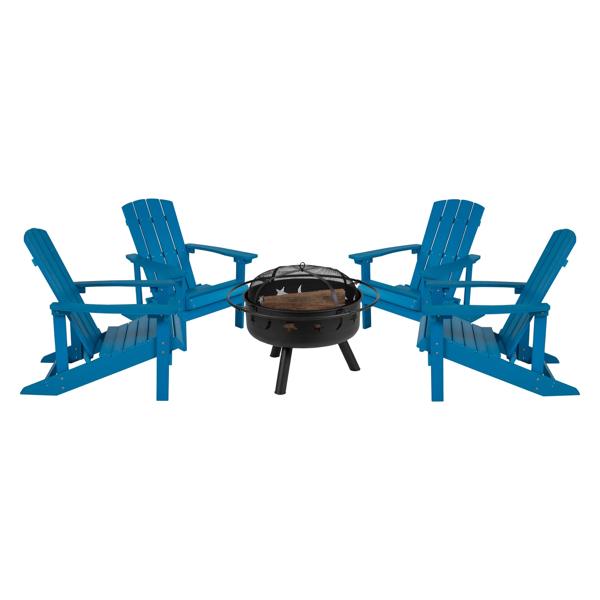 5 Piece Charlestown Blue Commercial Poly Resin Wood Adirondack Chair Set with Fire Pit - Star and Moon Fire Pit with Mesh Cover Dimensions: 29.5"W x 33.5"D x 35"H