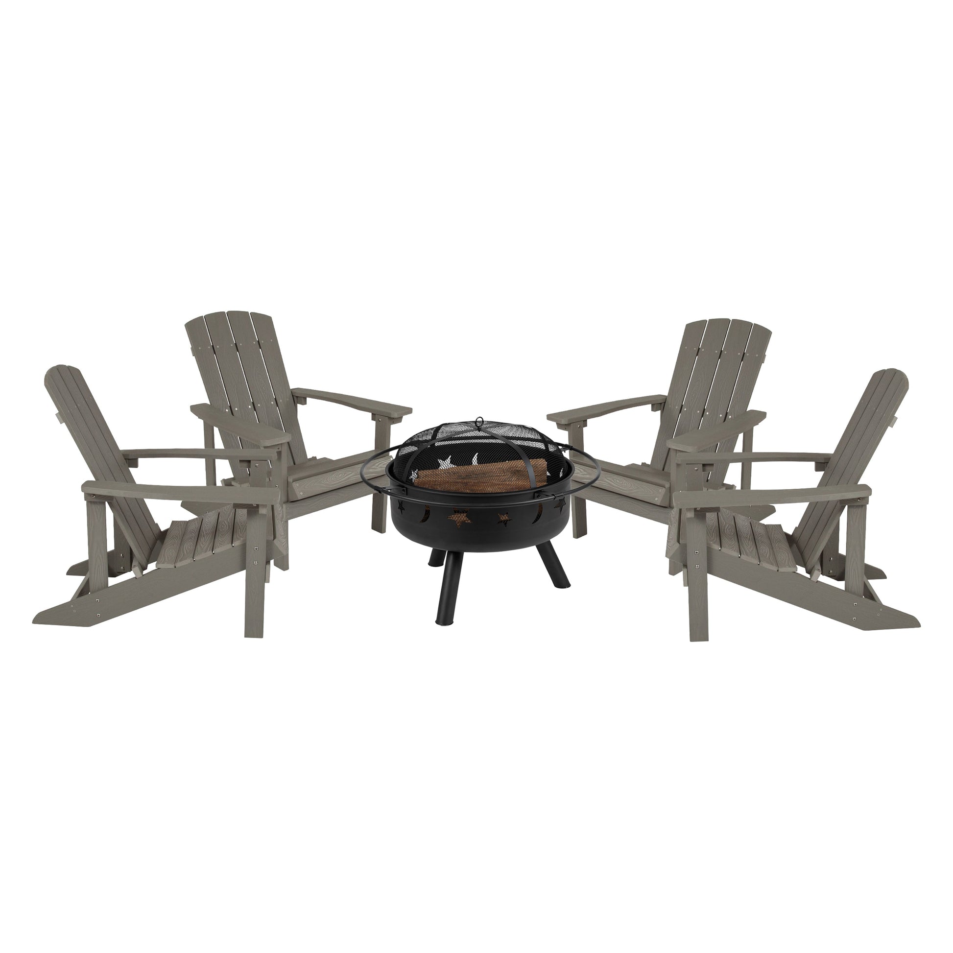 5 Piece Charlestown Commercial Gray Poly Resin Wood Adirondack Chair Set with Fire Pit - Star and Moon Fire Pit with Mesh Cover Dimensions: 29.5"W x 33.5"D x 35"H