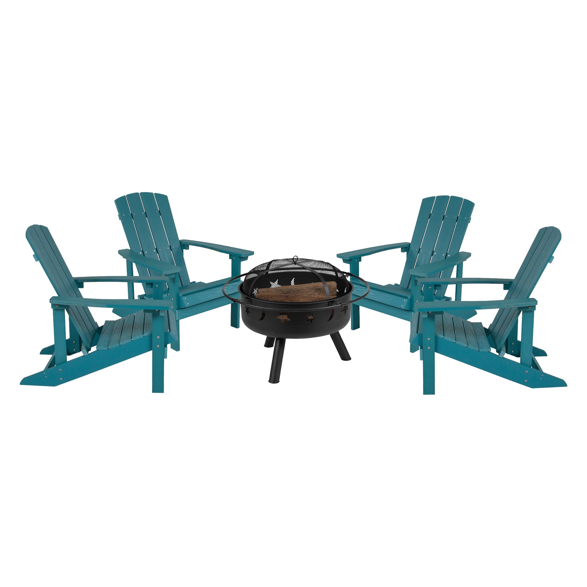5 Piece Charlestown Commercial Sea Foam Poly Resin Wood Adirondack Chair Set with Fire Pit - Star and Moon Fire Pit with Mesh Cover Dimensions: 29.5"W x 33.5"D x 35"H