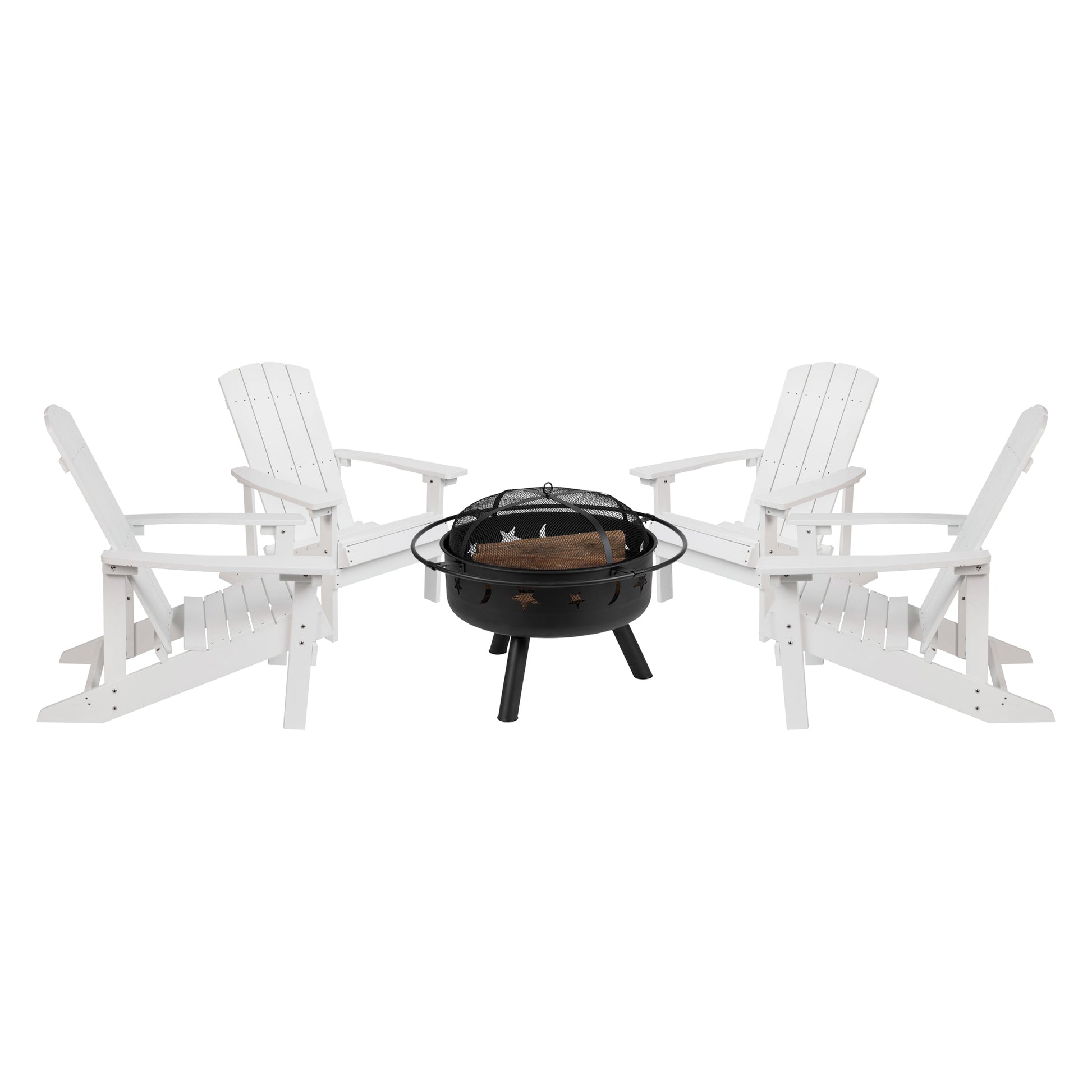 5 Piece Charlestown Commercial White Poly Resin Wood Adirondack Chair Set with Fire Pit - Star and Moon Fire Pit with Mesh Cover Dimensions: 29.5"W x 33.5"D x 35"H