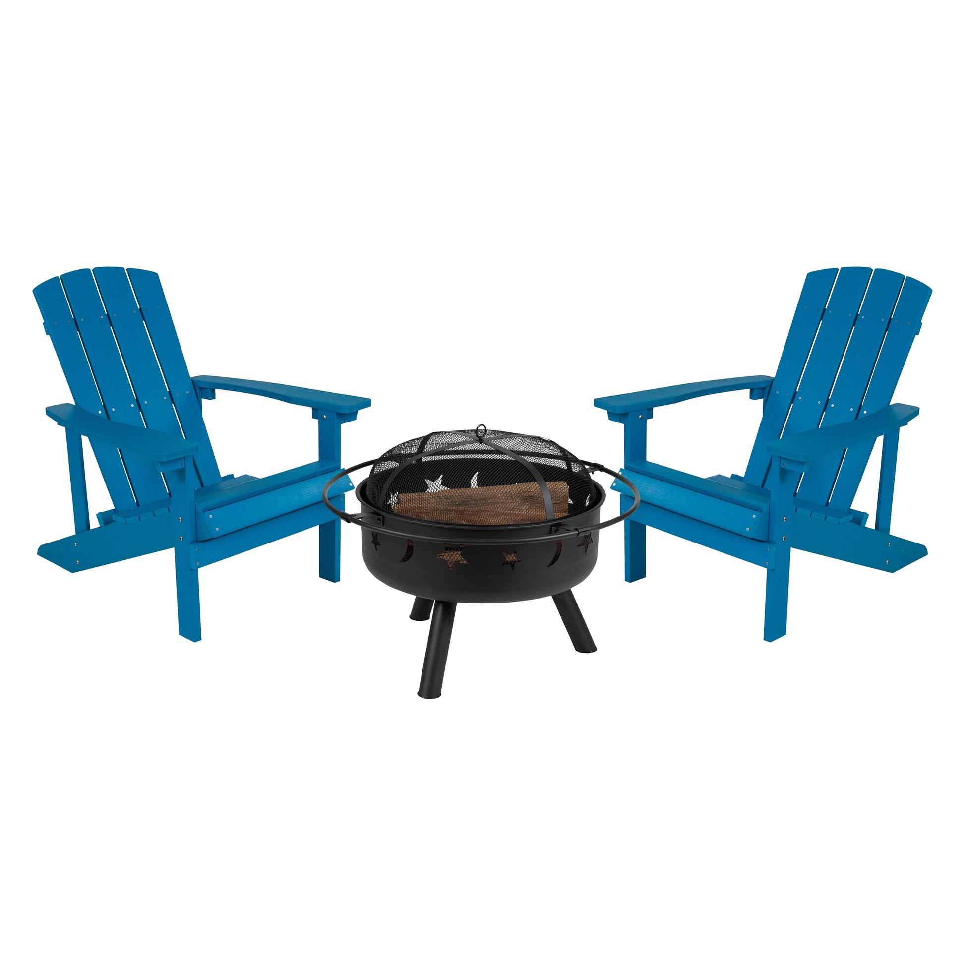 3 Piece Charlestown Commercial Blue Commercial Poly Resin Wood Adirondack Chair Set with Fire Pit - Star and Moon Fire Pit with Mesh Cover Dimensions: 29.5"W x 33.5"D x 35"H