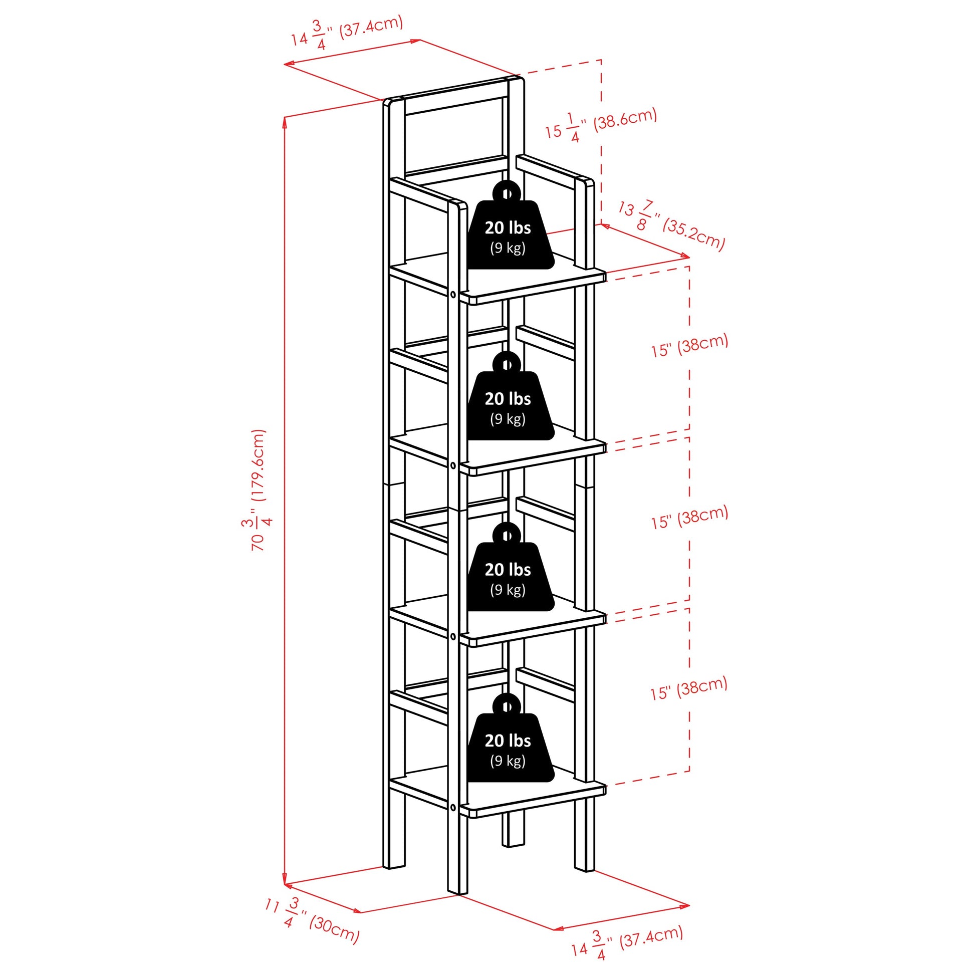 Weight capacity is 20 lbs. per shelf