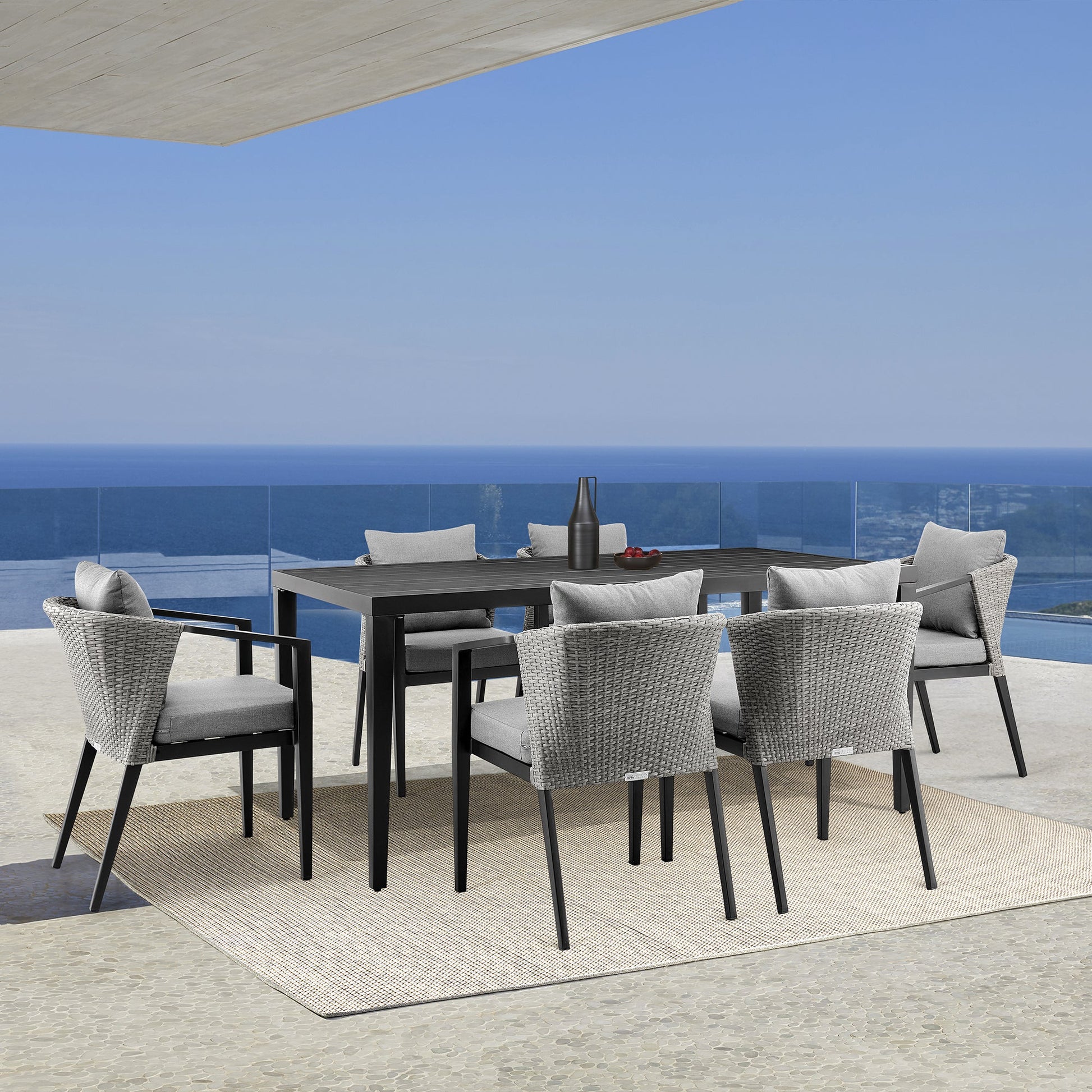 Enjoy your outdoor space to the fullest with the Aileen outdoor dining table from Armen Living. Defined by clean lines and refined silhouette, the patio table befits any setting indoor or outdoor. The rectangular outdoor dining table makes a sleek statement with the smooth and sturdy finish of black powder-coated aluminum, and it can easily incorporate to your existing decor. Crafted to perfection, our Aileen outdoor dining table can accommodate up to 8 seats. Aluminum is a light and rust proof material and can be moved from your backyard, to your screened in porch, to your garden with ease! The chic aluminum table and frame feature a multi-layer powder coating for effective protection from the weather, UV, everyday wear, and tear. The slat style tabletop of this outdoor furniture piece helps elements to easily pass through which adds to its durability, while the umbrella hole adds to its convenience. The surface of the patio dining table rests upon sleek, tapered legs to deliver timeless elegance, making it the ideal piece of outdoor patio furniture.