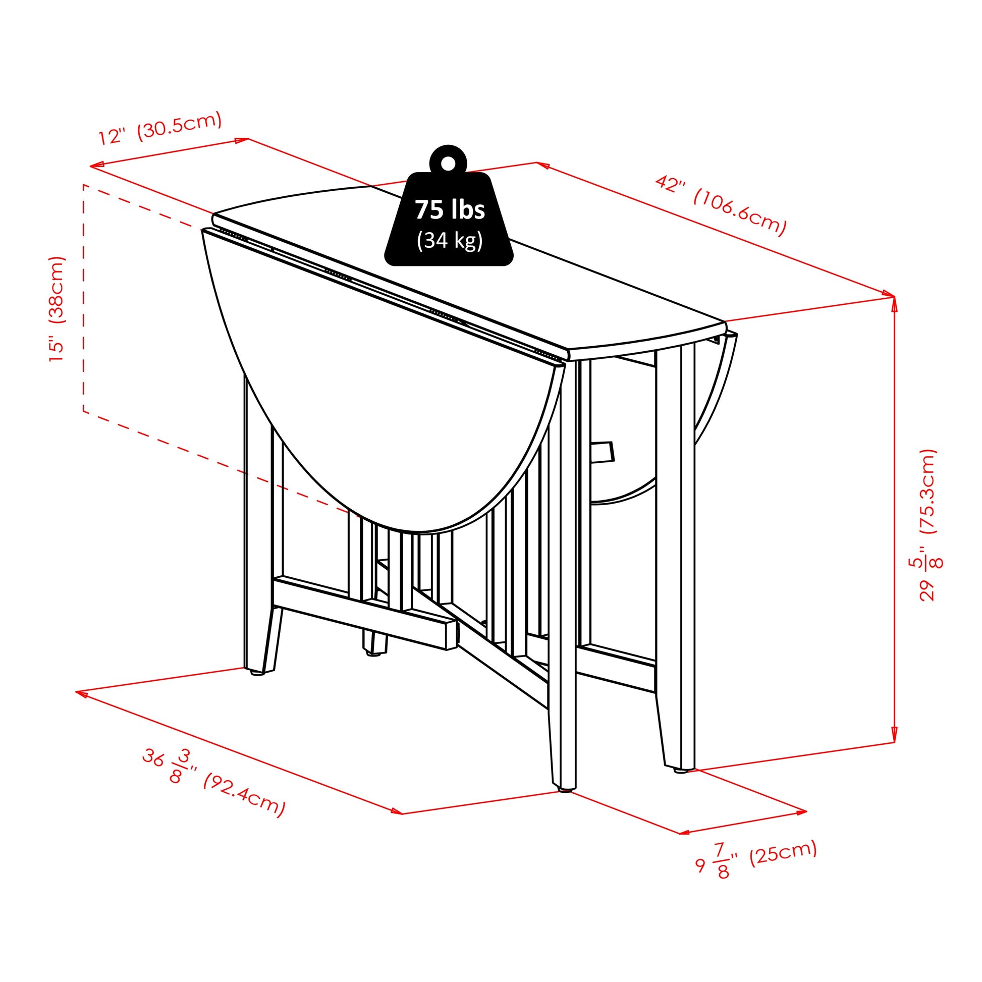 Add Alamo Round Drop Leaf Table and two chairs to your kitchen or sunroom. The round table comes with two drop leaves to accommodate smaller space and fully opens when you have more guests. Fully expand at 42" round and stands at 29.50" Tall. Each Drop leaf is 42"Wide by 14.87" Deep. Table opens with one leaf up is 42"W x 27.80" x 29.65"H. For storage, this table folds down to 41.97"W x 13.84"D x 29.65"H. Construction with combination of solid and composite wood. The set comes with 2 Ladder Back Chairs stands at 16.60"W x 20.50"D x 34.70"H. Seat height from ground is 18" and Seat back has 16.60"W x 16.69"H. Chairs are made from solid wood in warm walnut finish. Table and Chairs required assembly.Dimensions : 41.97 in. Wide 41.97 in. Deep 29.65 in. High