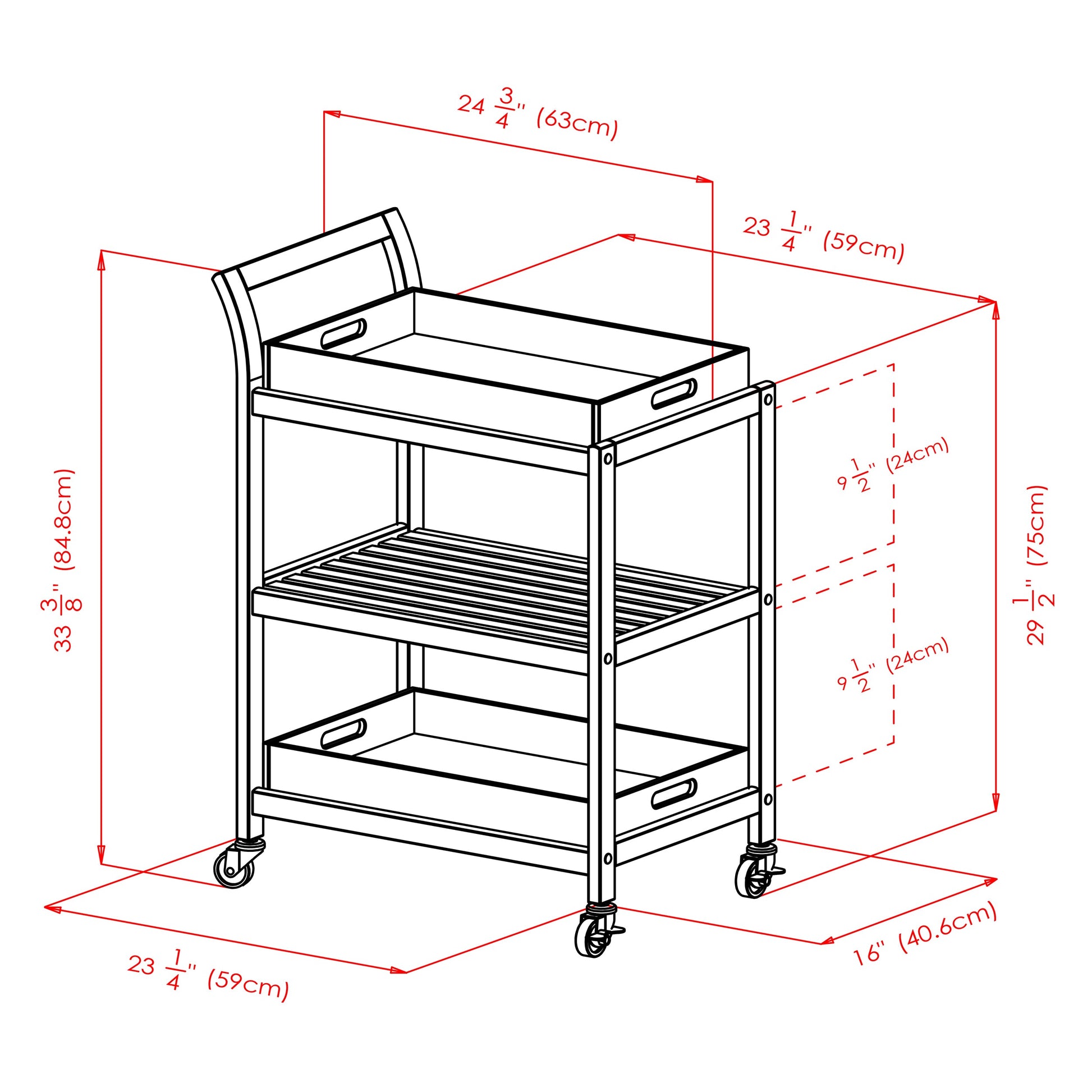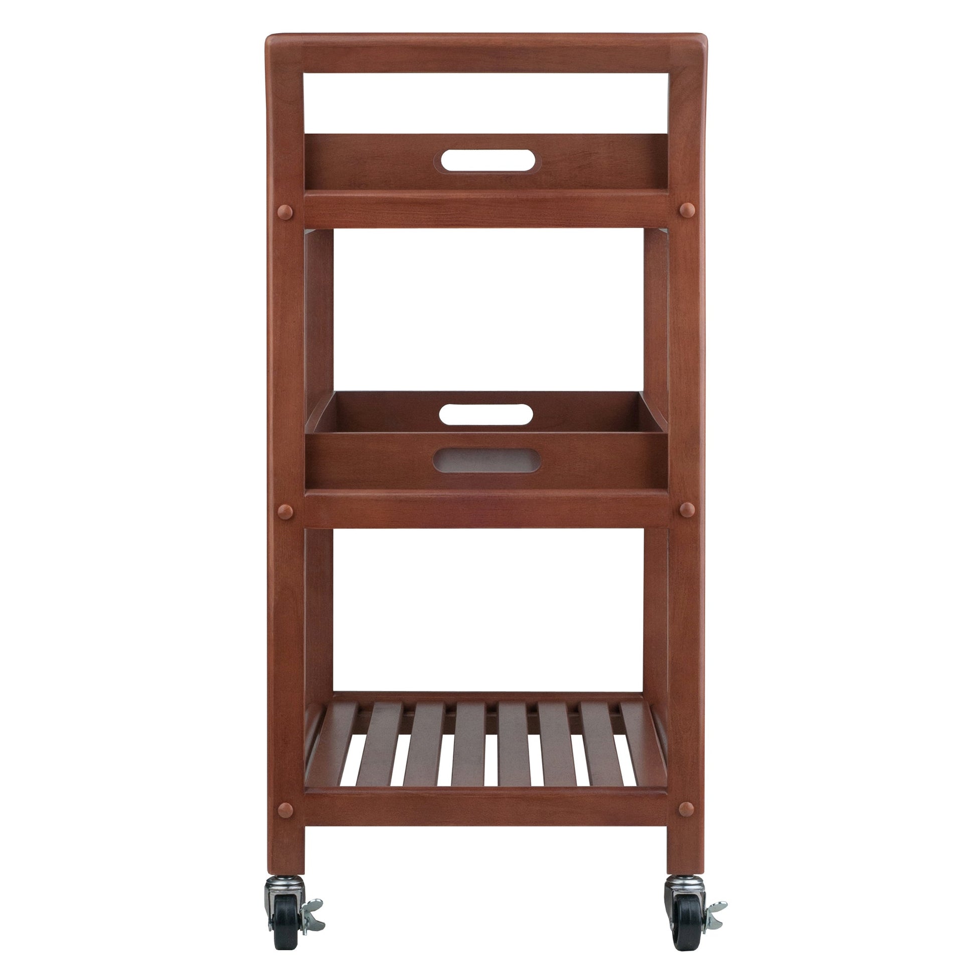 Roll the Winsome Wood Albert Entertainment Cart into your dining area, family room, or patio to get the party started. The middle and bottom shelves are removeable serving trays with cut-out handles, and includes a movable slatted wood shelf that can be placed on any tier. It also features a convenient curved handle for easy maneuvering and that doubles as a towel bar, and with four casters for smooth rolling. Perfect for bringing bottles, glassware and snacks to your guests. Made up of solid and composite wood in a warm walnut finish that will complement almost any decor. Ships in 1 box with all the hardware needed for assembly.