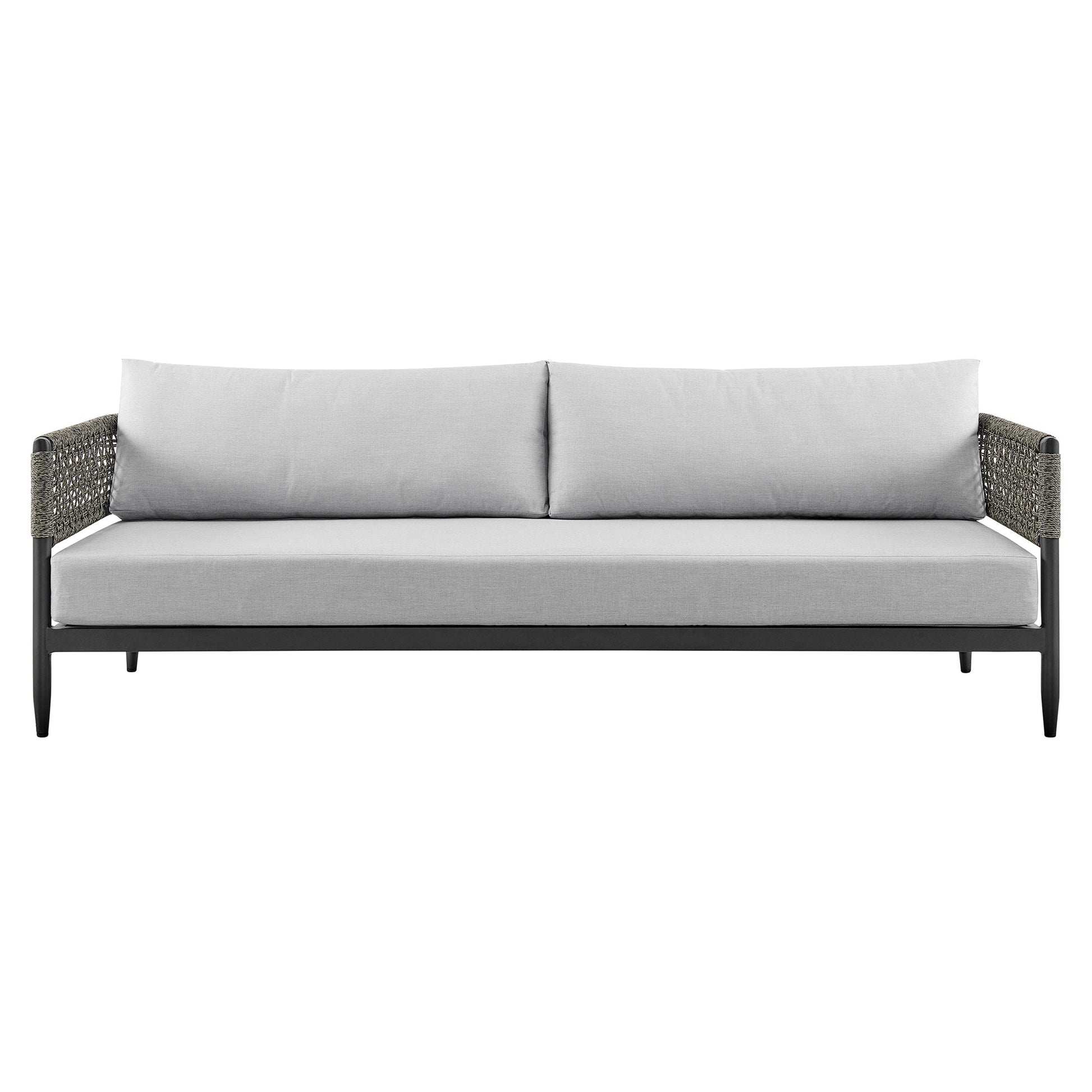 The Algeria 4 Piece Outdoor Rope and Aluminum Black Seating Set with Light Gray Cushions from Armen Living will mark all the boxes for a perfect outdoor seating set. Featuring 2 club chairs, an outdoor sofa, and a coffee table, this set is ideal for seating up to 5. The tough outdoor cushions are upholstered with stain, UV, and water-resistant, keeping you worry-free and relaxed. The Algeria features a polyester rope weave instead of wicker that is seen on most conventional outdoor furniture. The Algeria coffee table is perfect for morning or evening conversations while you watch the sunrise or sunset! Constructed of the highest quality materials, the Algeria 4 Piece Outdoor Rope and Aluminum Black Seating Set with Light Gray Cushions will provide enjoyment and comfort for many years to come.