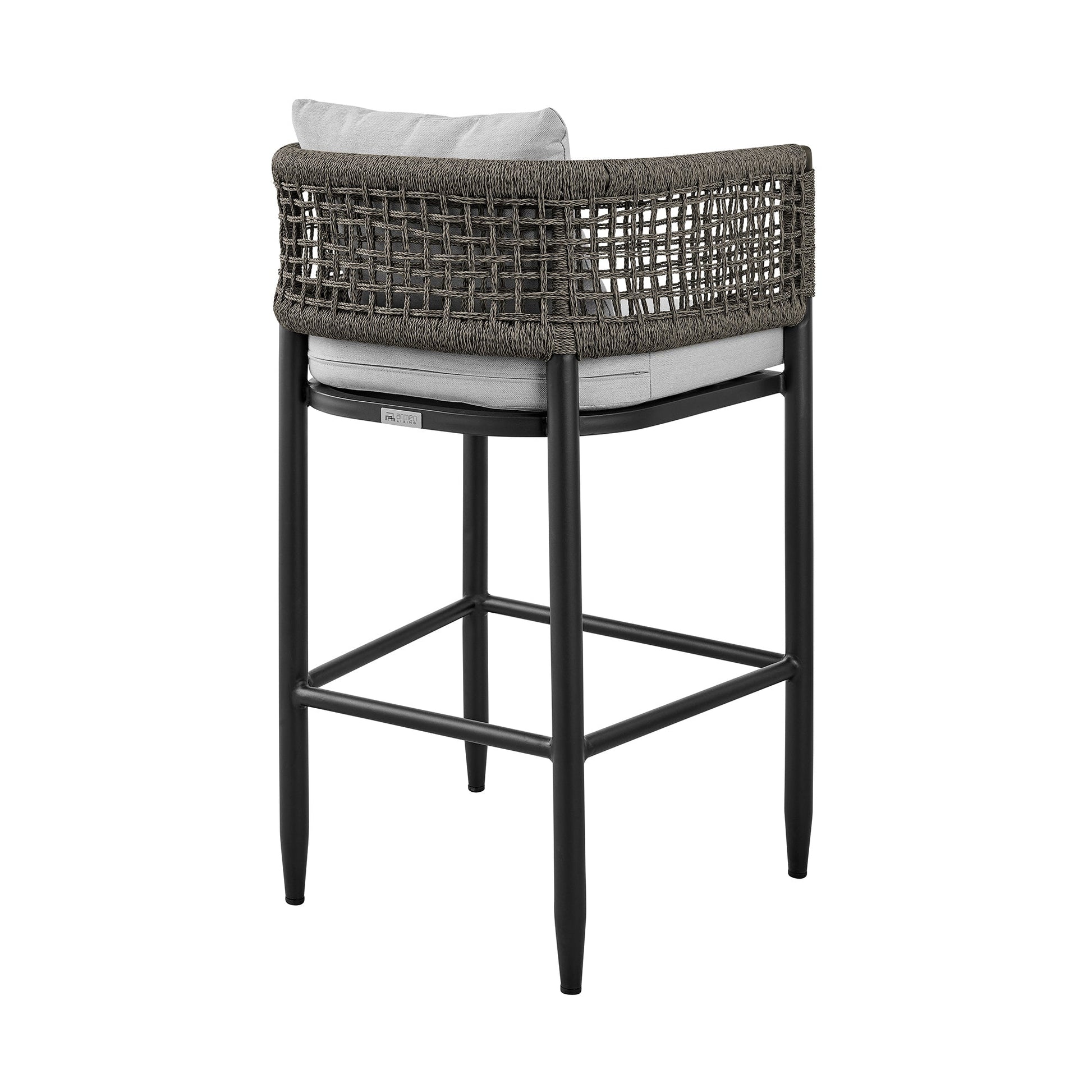 Transform your backyard space into the perfect entertainment destination with the Alegria Outdoor Patio 5-Piece Bar Set from Armen Living. This outdoor patio furniture set comes with 1 rectangular bar table and 4 bar stools. The chic aluminum stool frame and patio table feature a multi-layer powder coating for effective protection from the weather, everyday wear, and tear. The slat style tabletop helps elements to easily pass through which adds to the durability of the pub table. The modern and clean line silhouette of the Alegria bar height outdoor chairs with cushions is complimented by unique woven rope arms. The rope is treated to be protected from water, UV, oil, and fading. The light gray cushions not only feature high-density foam that will allow for many hours of comfortable seating; the cushions also feature a zipper closure that allows for easy removal and cleaning! This outdoor furniture is constructed from aluminum, which is a light material, and this set is easily portable! Enjoy the view whether you’re in your back yard, patio, screened-in porch, garden, or poolside! The Alegria 5-Piece Bar Height Dining set supports up to 308lbs per seat and is available in a black finish with gray rope and upholstery.
