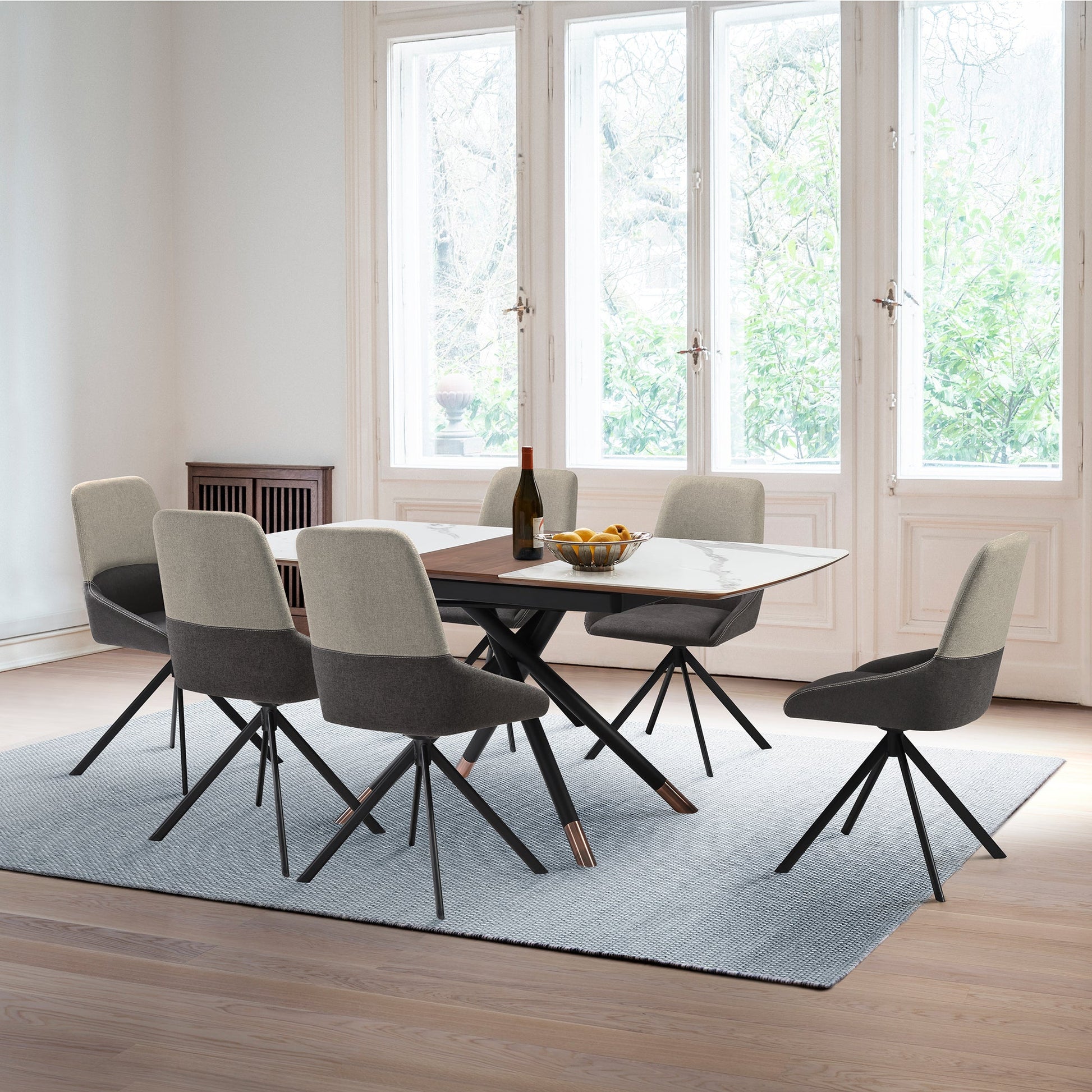 The Alora Maverick Extendable 7 Piece Dining Set with Swivel Chairs includes 6 Maverick swivel dining chairs and 1 Alora extendable dining table. The dining room chairs blend crisp lines and sleek details to lend a dose of comfort and style. They feature soft upholstery to serve as a chic and comfortable accent for any room. Elevated upon pyramid-shaped, black metal legs, the kitchen chairs remain an effortless and versatile addition to your home. They feature a tall, scoop-back to provide long-lasting comfort and support, enabling you to sit for long hours. Our dining table chair can serve as a stylish and comfy office chair or provide a comfortable seat in your living room. The Maverick includes a wonderful 180 – degree swivel function to offer maximum mobility and ease with following conversations. The Maverick is upholstered in a soft polyester fabric or UV and stain-resistant faux leather which does not crack or fade easily to provide easy maintenance. The tabletop features a harmonious combination of light gray ceramic with a walnut finished wood accent in its center. Rounded edges attain a soft silhouette, and the metal cross leg base brings a cool touch with the copper caps. This table can easily extend from 51” to 67” to comfortably seat up to six of your closest friends or family members. From a perfect spot to enjoy your casual meals to a luxe place to host your formal dinners, our dining table remains a versatile and stylish addition to your home. The table is expertly crafted to offer durability and easy maintenance. This kitchen dining set is available in 5- or 7-piece set configurations and your choice of two-tone gray fabric or taupe gray faux leather upholstery.