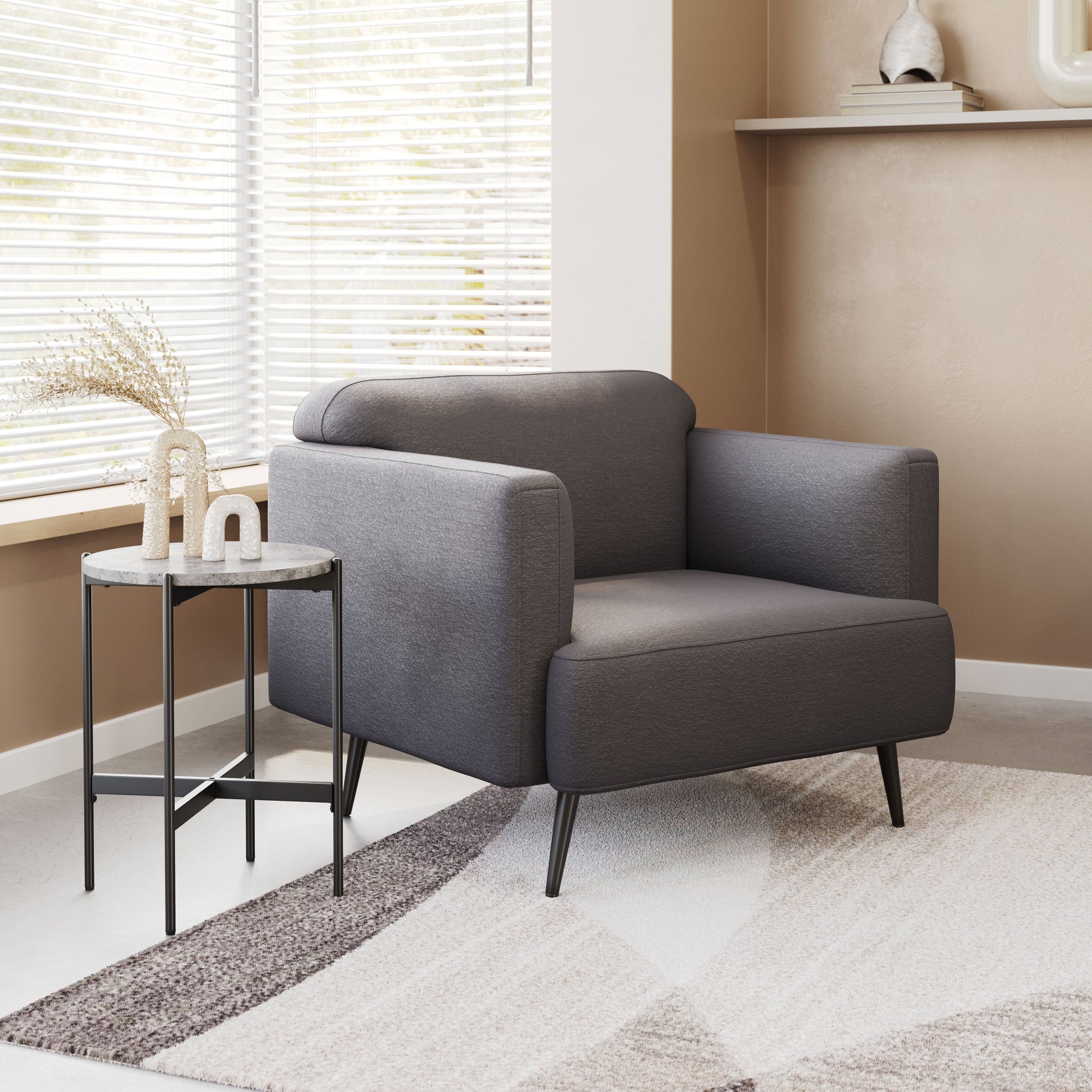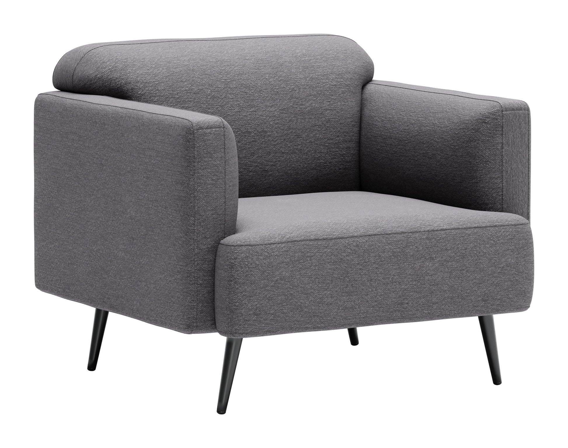 The Amsterdam Arm Chair is wrapped in polyester fabric. This chair has a comfy modern design.