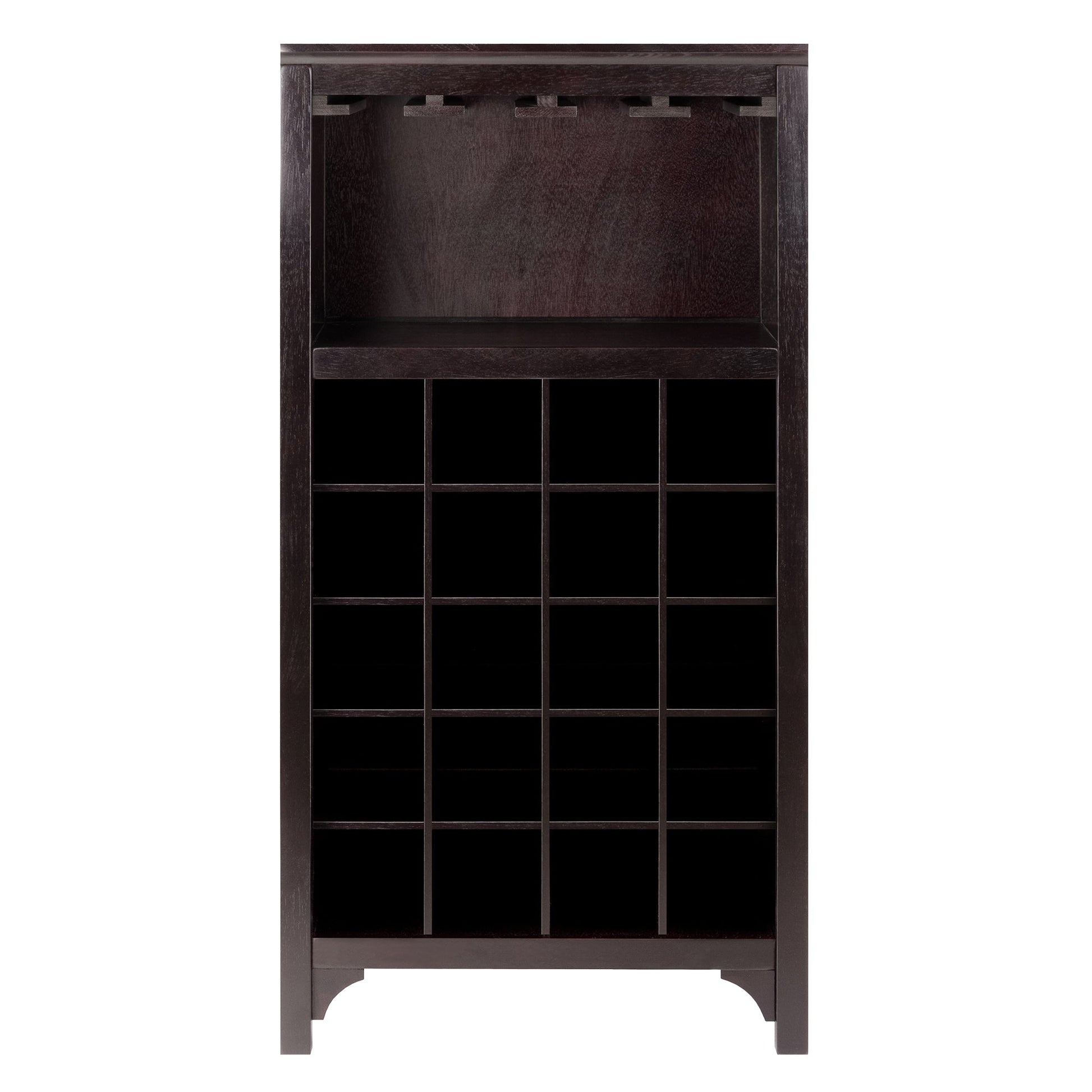Add this compact Ancona Wine Modular unit to your home. Create a unique look with one unit or any combination of the three styles available. This unit has glass hanger and holds 20 bottles of wine. Overall assembled size is 19.009"W x 12.60"D x 37.52". Glass hanger inside clearance is 16.73"W x 11.06"D x 8.62"H. Made with combination of solid and composite wood in Dark Espresso Finish. Assembly Required.Dimensions : 19.09 in. Wide 12.6 in. Deep 37.52 in. High