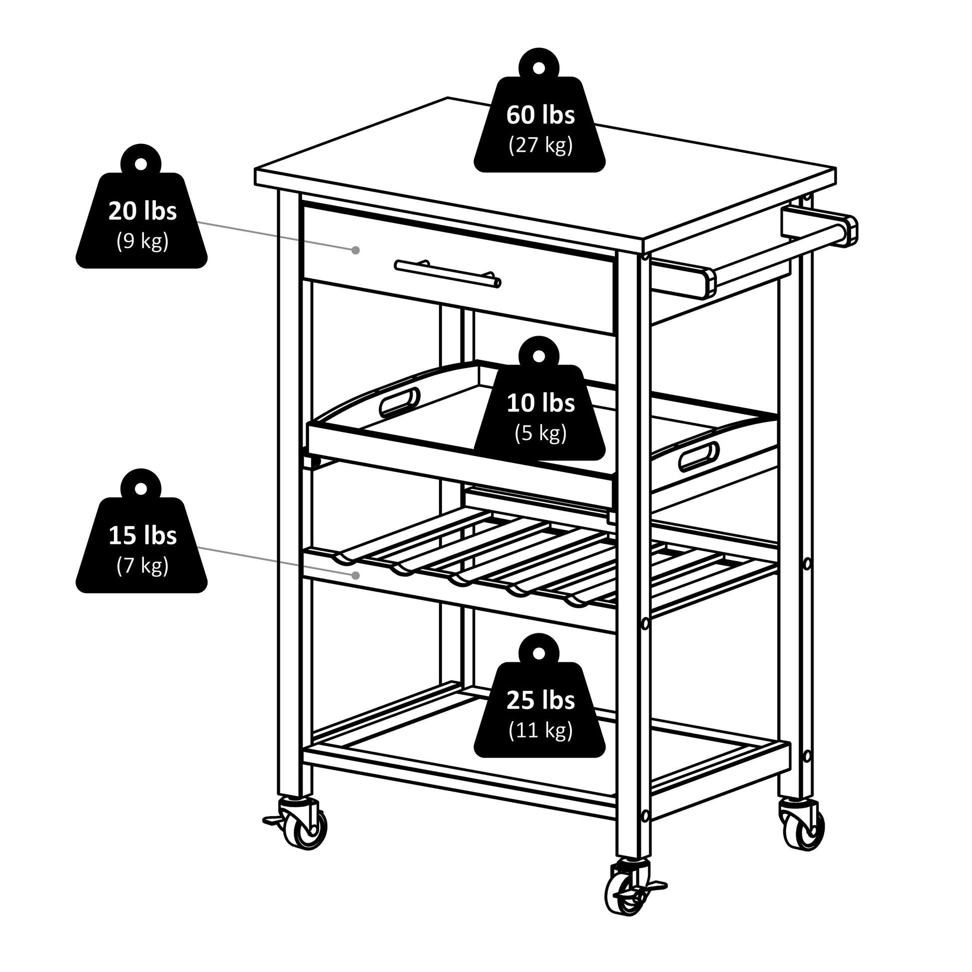 Give your kitchen a modern, functional touch with this Winsome Wood Anthony Stainless-Steel Kitchen Cart. It features a storage drawer, removable storage tray, wine rack, shelf and towel handle. The Stainless Steel top provides an easy-to-clean work station and serves as an ideal cutting board. This remarkably functional cart has a removable serving tray with cut-out handles, ideal for carrying drinks and snacks. Store up to 5 bottles of wine on the rack below, and use the bottom shelf for additional storage or display. The easy-glide drawer adorned with a nickel finish handle is great for kitchen utensils or silverware, and the side handle can be used as a towel rack. The cart rolls easily on casters and has two locking wheels to keep the unit stable while in use. Its size makes the cart perfect for a small kitchen or dining area. Constructed of sturdy solid and composite wood finished in black with a stainless-steel top. Packed in one box, with hardware necessary for assembly.