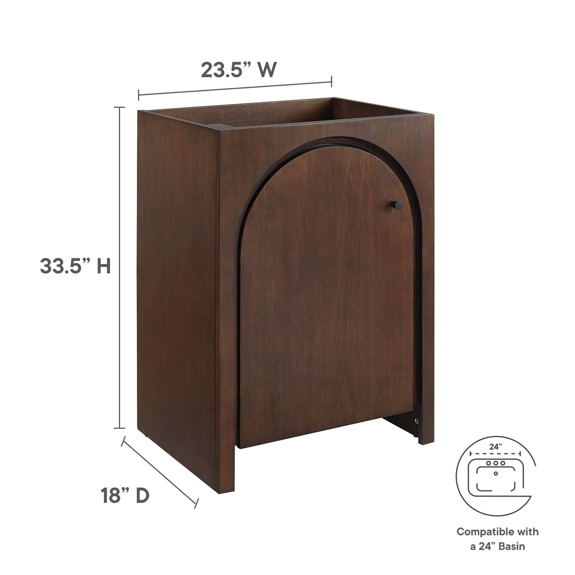 Elevate your bathroom's style with the Appia 24" Bathroom Vanity Cabinet, where retro elegance meets functionality. Expertly crafted from high-quality MDF and adorned with a mango wood veneer, this small space vanity cabinet brings stunning organic aesthetics to your bathroom. Its unique arched door adds beautiful dimension to any primary or guest bathroom. Featuring soft-close hinges, the Appia compact vanity offers a smooth, quiet experience and includes an adjustable shelf with a convenient plumbing cut-out, providing ample storage for all your bathroom essentials. Assembly is straightforward, ensuring you can enjoy this stylish and modern vanity effortlessly. Sink basin and fixtures are not included with this chic and practical bathroom vanity cabinet. Includes adjustable non-marking foot pads to protect flooring. Top Panel Weight Capacity: 200 lbs. Overall Product Dimensions: 18"L x 24"W x 33.5"H