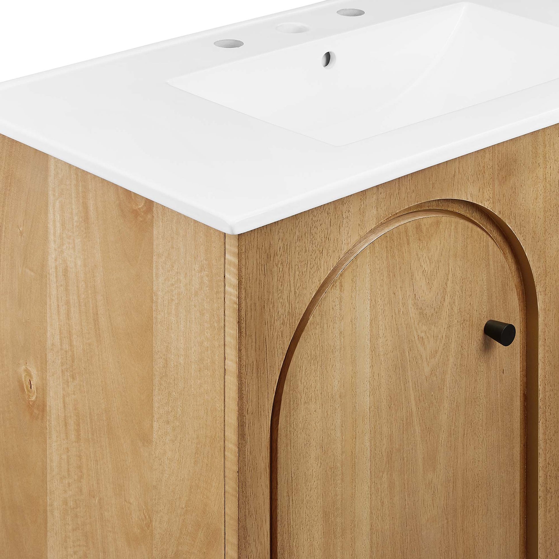 Elevate your bathroom's style with the Appia 36" Single Bathroom Vanity Cabinet, where retro elegance meets functionality. Expertly crafted from high-quality MDF and adorned with a mango wood veneer, this vanity cabinet brings stunning organic aesthetics to your bathroom. Its two arched doors add beautiful dimension to any primary or guest bathroom. Featuring soft-close hinges, the Appia sink vanity offers a smooth, quiet experience and includes an adjustable shelf with a convenient plumbing cut-out, providing ample storage for all your vanity bathroom essentials. With its white ceramic sink basin with 8" centerset holes and integrated countertop, this sink cabinet easily becomes a functional centerpiece in any bathroom. Assembly is straightforward, ensuring you can enjoy this stylish and modern vanity effortlessly. Includes adjustable non-marking foot pads to protect flooring. Fixtures not included. Overall Product Dimensions: 18.5"L x 36"W x 34.5"H
