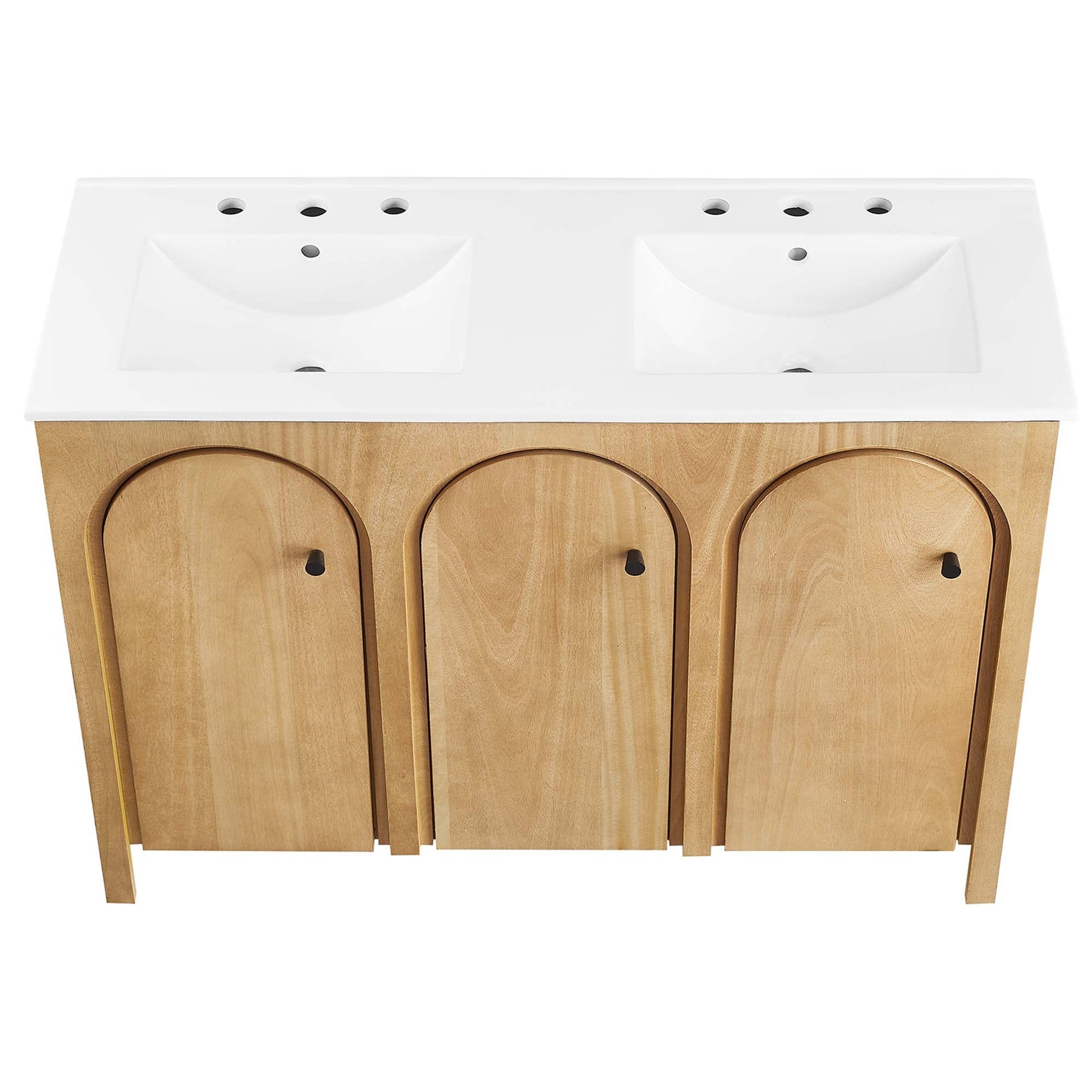 Elevate your bathroom's style with the Appia 48” Double Bathroom Vanity Cabinet, where retro elegance meets functionality. Expertly crafted from high-quality MDF and adorned with a mango wood veneer, this vanity cabinet brings stunning organic aesthetics to your bathroom furniture collection. Its three arched doors add beautiful dimension to any primary or guest bathroom. Featuring soft-close hinges, the Appia two sink vanity offers a smooth, quiet experience and includes adjustable shelves with convenient plumbing cut-outs, providing ample storage for all your vanity bathroom essentials. With its white double ceramic sink basin with 8" centerset holes and integrated countertop, this double sink vanity is a great choice for couples, and easily becomes a functional centerpiece in any bathroom. Assembly is straightforward, ensuring you can enjoy this stylish and modern vanity effortlessly. Includes adjustable non-marking foot pads to protect flooring. Fixtures not included. Overall Product Dimensions: 18.5"L x 48"W x 34.5"H