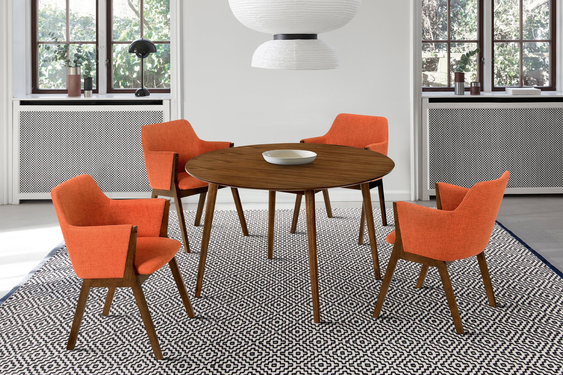 The Arcadia and Renzo 48" Round Orange and Walnut Wood 5 Piece Dining Set is the fashion forward addition that is perfect for any eat in kitchen or dining room. This 5-piece dining set will open your dining room with its clean, round table and modern chairs. Meticulous craftsmanship and expert design have gone into the creation of this dining set, which is as functional as it is stylish. Hints of Scandinavian design and a mid-century modern feel come together to create the perfect space to share a meal with friends and family. With the 48" diameter table, you can easily pull up a few extra chairs and easily accommodate more guests. Round tables are great because they can accommodate the most people. It's easy to squeeze in an extra table setting or two where there aren't any corners! These amazing Renzo chairs feature a bold and strong wooden frame that adds striking, rich qualities to these chairs - also ensuring longevity to give you years of enjoyment. The Arcadia and Renzo 48" Round 5 Piece Dining Set is available in your choice of a black wood finish with gray upholstered chairs, or a walnut wood finish with blue, charcoal, or orange upholstery.