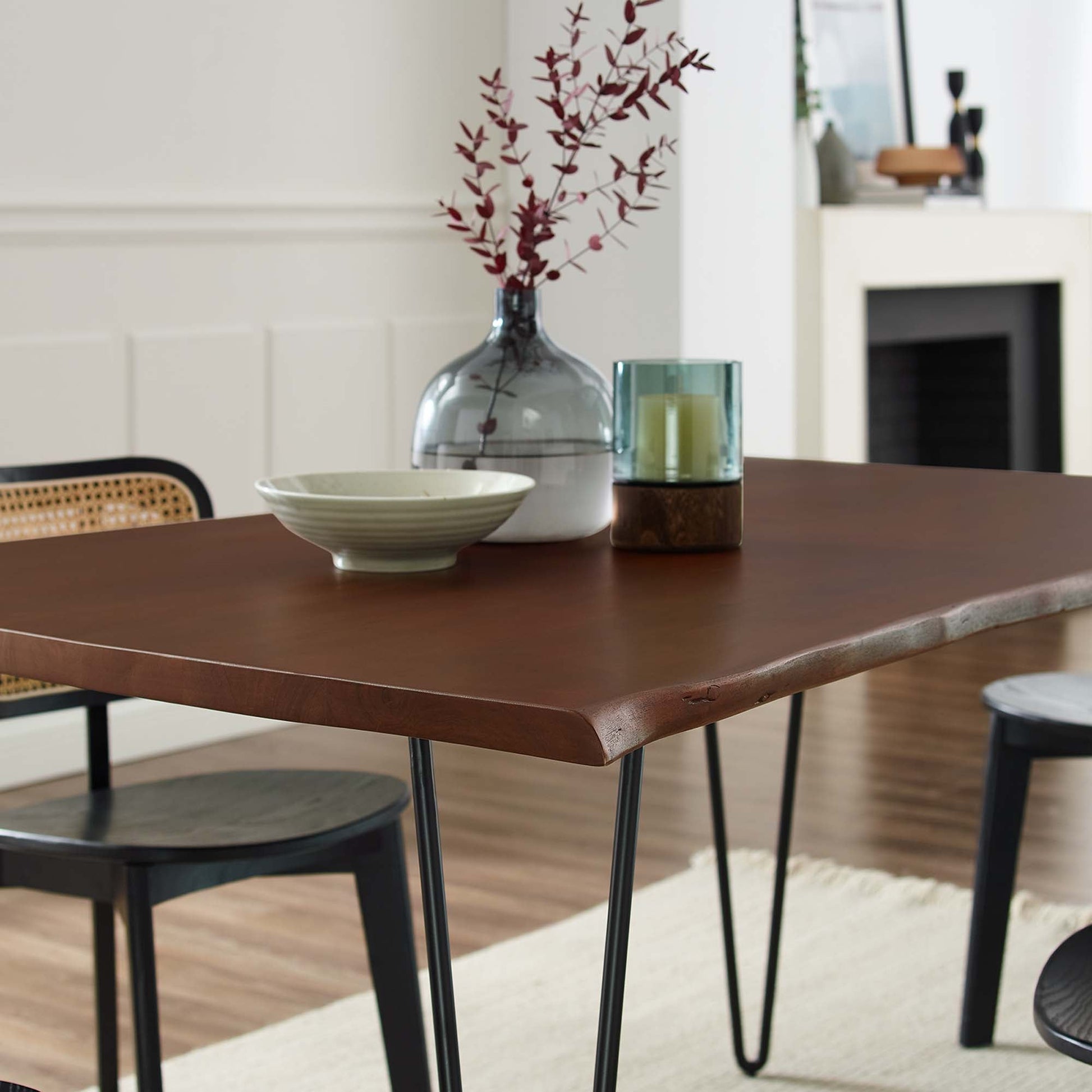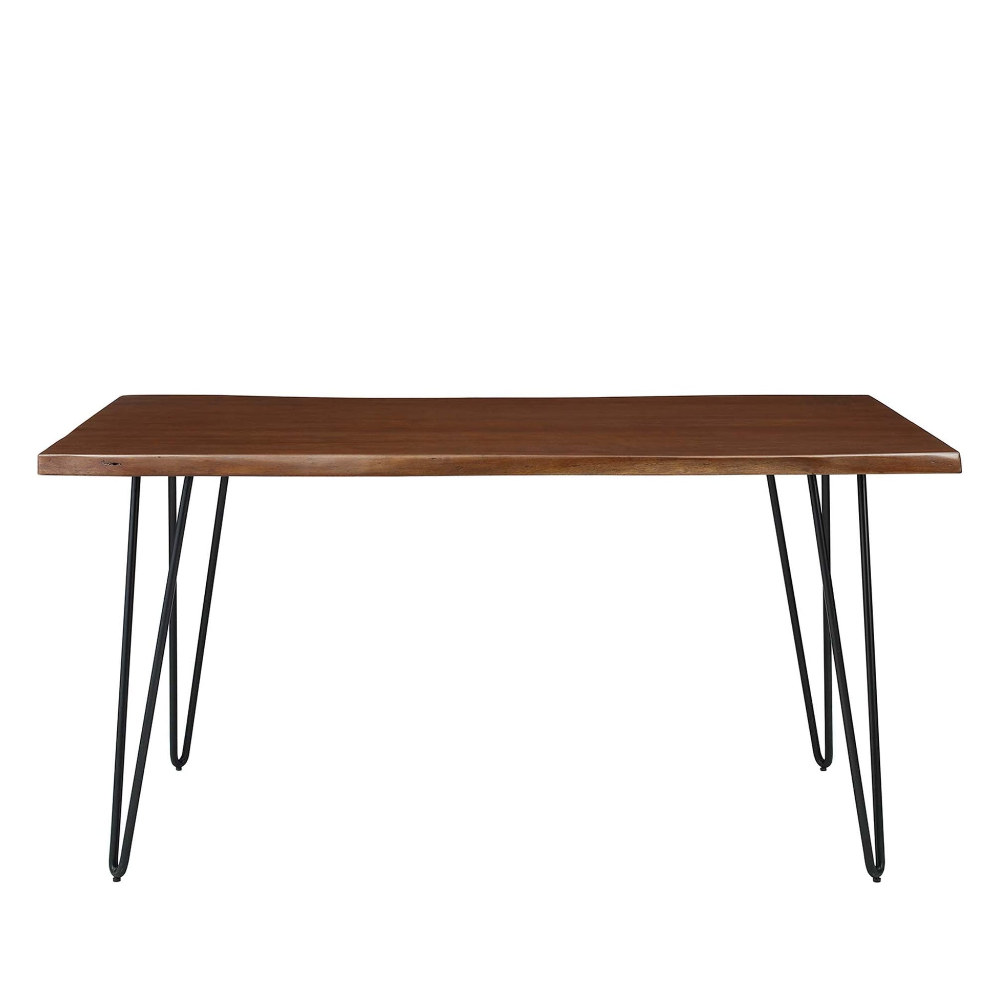 Sit amidst organic intrigue and retro style with the Ardor Rectangular Live Edge Dining Table. Featuring a one-of-a-kind raw edge tabletop crafted with a solid piece of acacia wood, this dining table is brimming with natural beauty. Comfortably accommodating six dining chairs, this 60" table rests on four powder-coated metal hairpin legs. This versatile dining table is ideal for everyday dining and entertaining and can also serve as a functional office desk. Due to the natural characteristics of the wood, each live edge table is unique. Includes non-marking foot pins to protect flooring. Assembly required. Overall Product Dimensions: 36"L x 60"W x 30"H