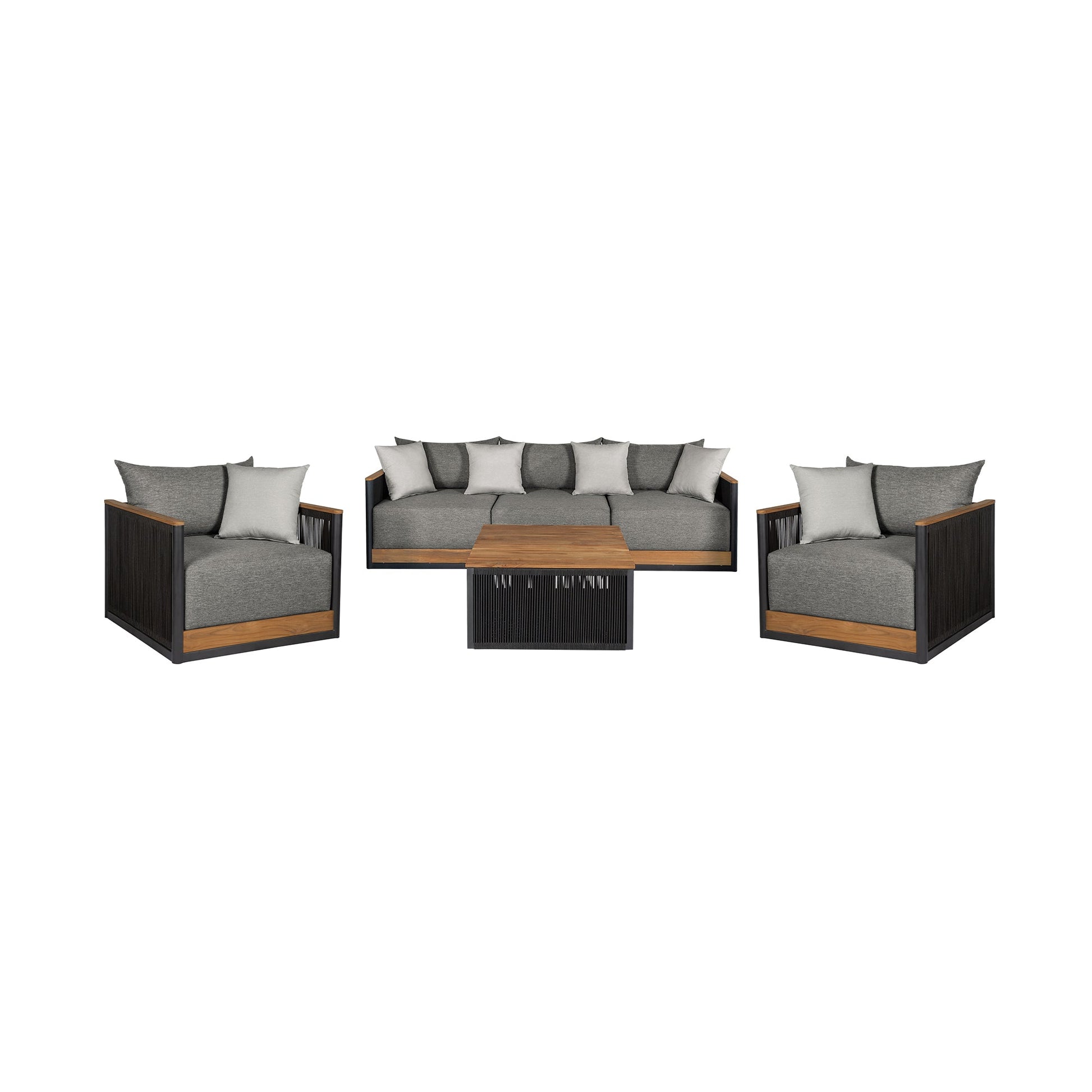 Transform your outdoor space with the Artesia Outdoor Patio Conversation Collection, a harmonious blend of timeless elegance and contemporary design meticulously crafted to redefine your outdoor living space The Artesia Outdoor Patio Sofa is a stunning piece that seamlessly combines the enduring beauty of teak wood with modern black rope accents and plush dark gray Olefin cushions. The teak wood frame brings classic sophistication to your patio, infusing your outdoor space with a natural allure that stands the test of time. Weather-resistant properties ensure the sofa retains its beauty even in changing weather conditions. Designed to endure the elements, it boasts water-resistant and UV-resistant features, promising resilience and style in every season. The black rope accents add a contemporary flair, creating a visually striking contrast with the warm tones of teak wood. Paired with sumptuous dark gray Olefin cushions, the Artesia Sofa invites you to relax in comfort and style. Water-resistant capabilities and easily removable cushion covers make maintenance effortless. The sofa comes complete with four throw pillows, adding an extra layer of luxury and personalization to your outdoor lounging experience. The Artesia Outdoor Patio Chair shares the same blend of timeless elegance and contemporary design, featuring teak wood, black rope accents, and plush dark gray Olefin cushions. With inherent weather-resistant properties, this chair stands as a steadfast centerpiece for your outdoor gatherings. The black rope accents and dark gray cushions create a harmonious contrast with the warm tones of teak wood, providing comfort and style. Water-resistant capabilities and easily removable cushion covers make maintenance a breeze. The chair comes complete with one throw pillow, adding an extra layer of luxury to your outdoor lounging experience. Completing the ensemble is the Artesia Outdoor Patio Coffee Table, a sublime fusion of natural beauty and contemporary design. Crafted with meticulous attention to detail, the teak wood frame brings timeless elegance to your patio. Weather-resistant properties ensure the coffee table stands up to the rigors of outdoor living, maintaining its beauty in various weather conditions. Water-resistant and UV-resistant features promise resilience and style in every season. The black rope accents add a contemporary touch, creating a harmonious contrast with the warm tones of teak wood. The spacious surface provides ample room for drinks, snacks, or decorative elements, making the Artesia Coffee Table not just a functional piece but a stylish focal point for your outdoor space. Elevate your patio with the Artesia Outdoor Patio Furniture Collection—a testament to enduring elegance and contemporary design that seamlessly fuses style with outdoor durability.