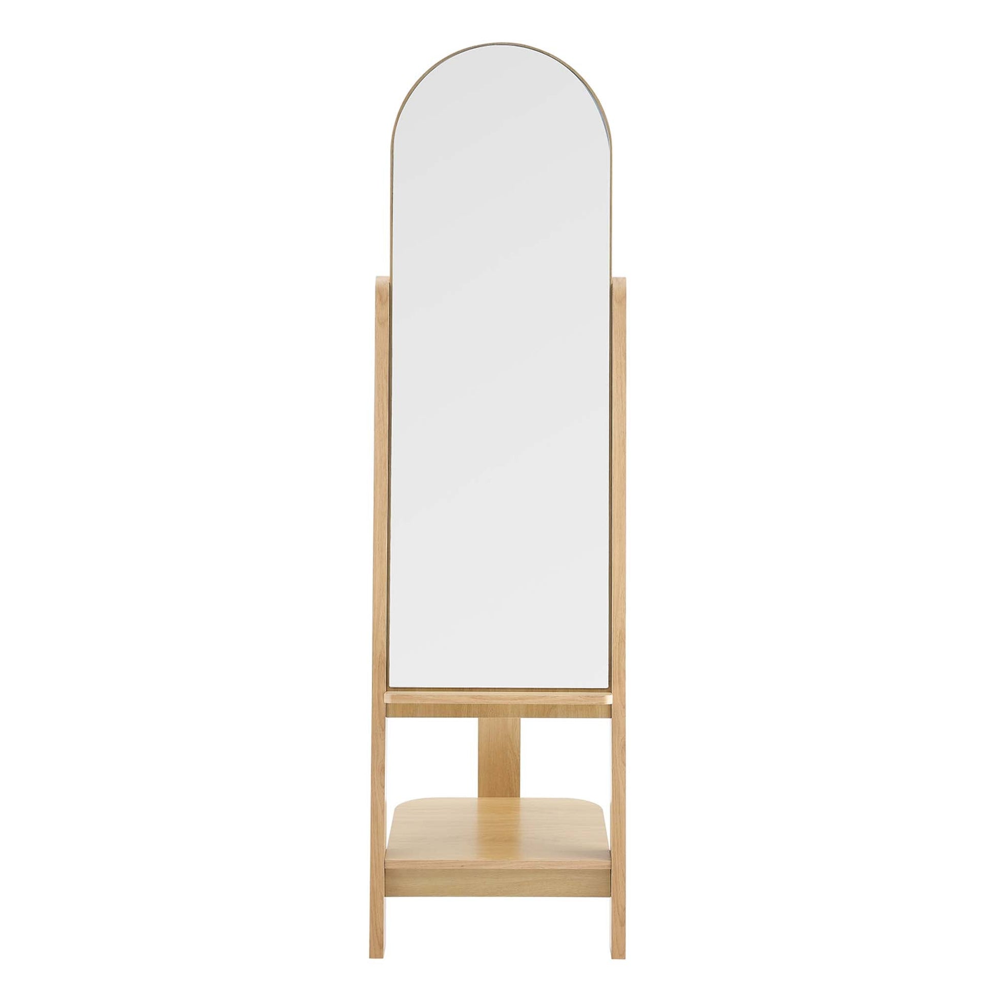 Brighten up any room with the Ascend Standing Mirror. Featuring a curved glass mirror with an arched shape, this easel mirror is crafted from a combination of mindi wood, MDF, and particleboard with a beautiful wood grain laminate. It's versatile design boasts a shallow shelf under the mirror and two open shelves for either storage or display, while three clothing pegs offer functional hanging space. Appraise outfit selections on your way out the door with this stylish addition to a bedroom, living room, entryway, or other living space. Easy to follow assembly instructions included. Overall Product Dimensions: 16.5"L x 17"W x 62.5"H