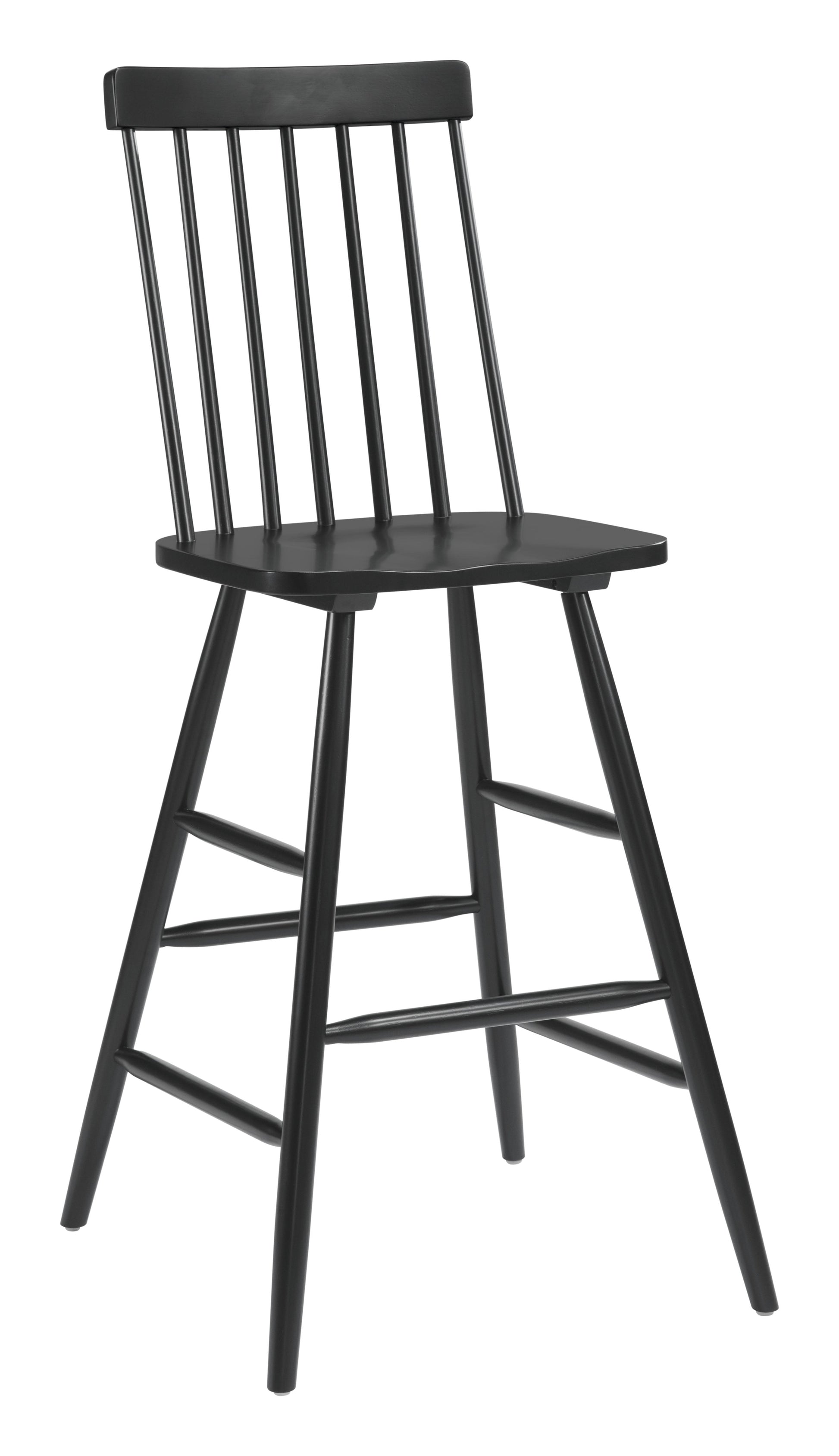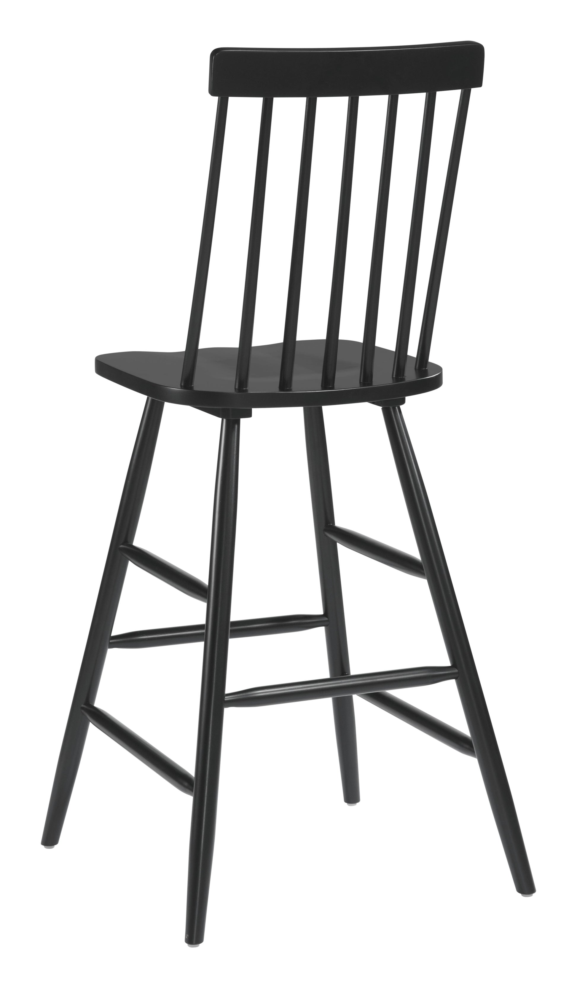 The Ashley barstool is play on the classic Windsor chair, with its time-honored spindles, saddle seat and curved back. Made of rubberwood, the chair is stained deep black for contrast. Perfect for a spin on any mid century modern, urban, or industrial space.