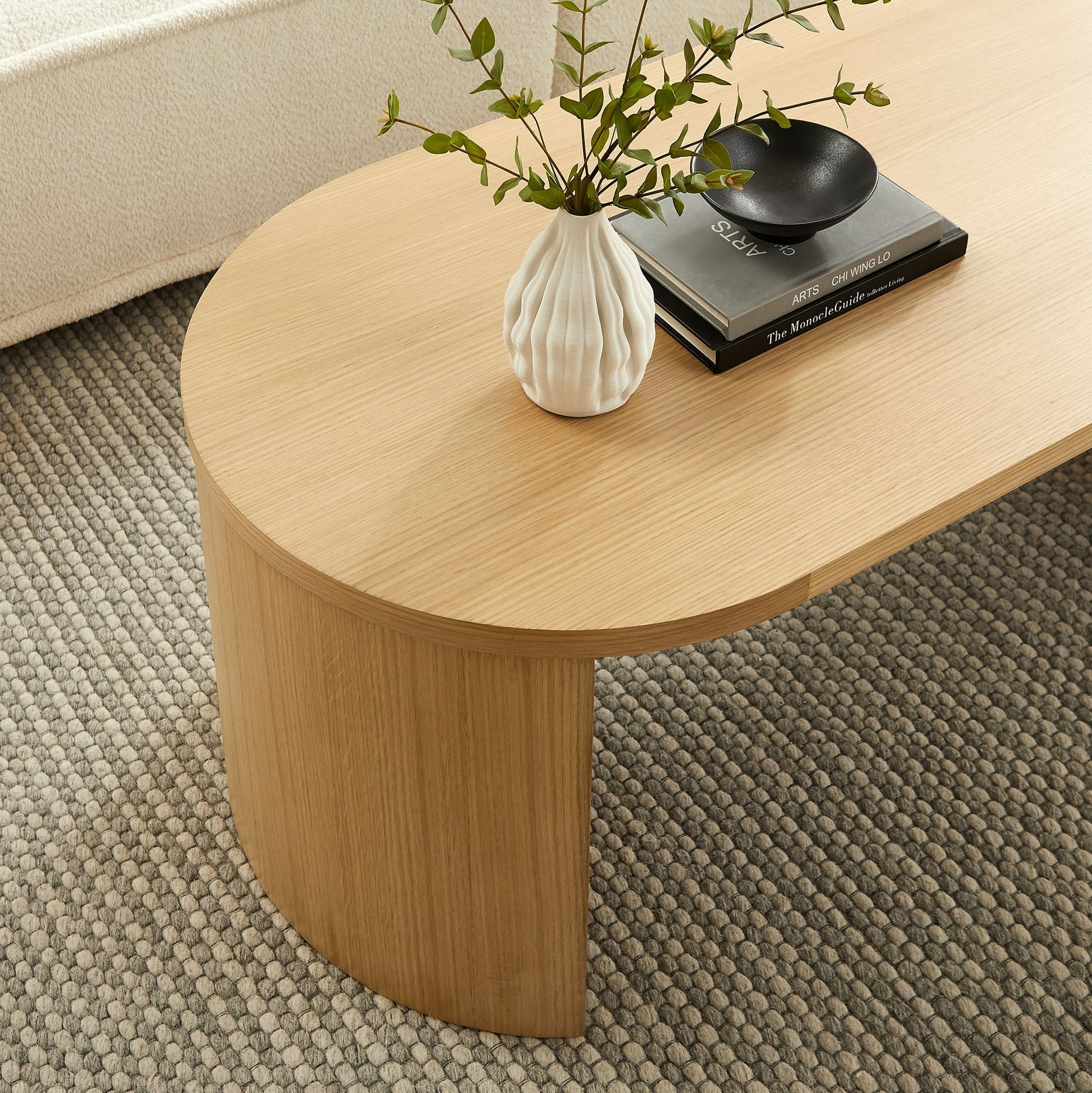 Bring a modern touch to your living room with the sleek tabletop and innovative leg design of the Aspect Oval Coffee Table. Crafted from high-quality oak wood veneer and MDF, this 47" oval center table is both stylish and durable. The legs feature a unique arched design that can be reversed to face inward or outward, allowing you to customize the look of the Aspect living room coffee table. The adjustable, non-marking levelers ensure stability on any surface while protecting your floors, making this oval wood coffee table an essential addition to any home. Whether you’re furnishing a new apartment or updating your living room, home office, or lounge area, the Aspect Wood Coffee Table seamlessly combines form and function. Straightforward assembly is required. Overall Product Dimensions: 23.62"L x 47.24"W x 16.93"H