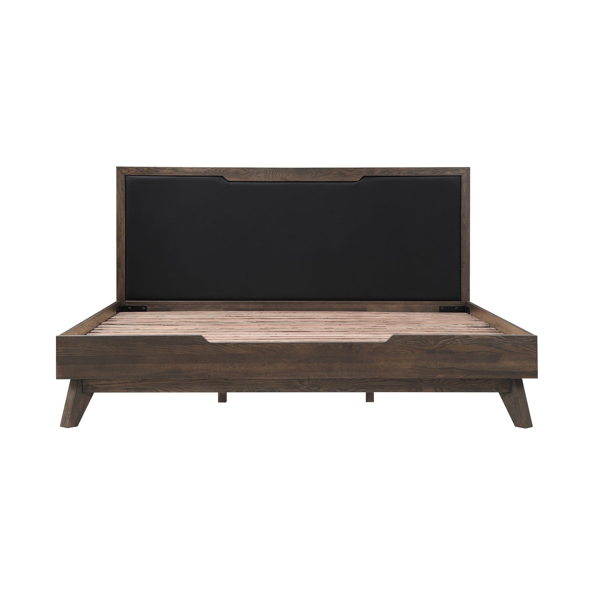 The chic design showcases a solid oak border that complements the soft black faux leather, creating a striking contrast in color and texture. With a gorgeous gray wash finish, the natural wood grain variations are accentuated, adding depth and character to your space. Additionally, ample storage space beneath the bed frame offers practicality without compromising style.