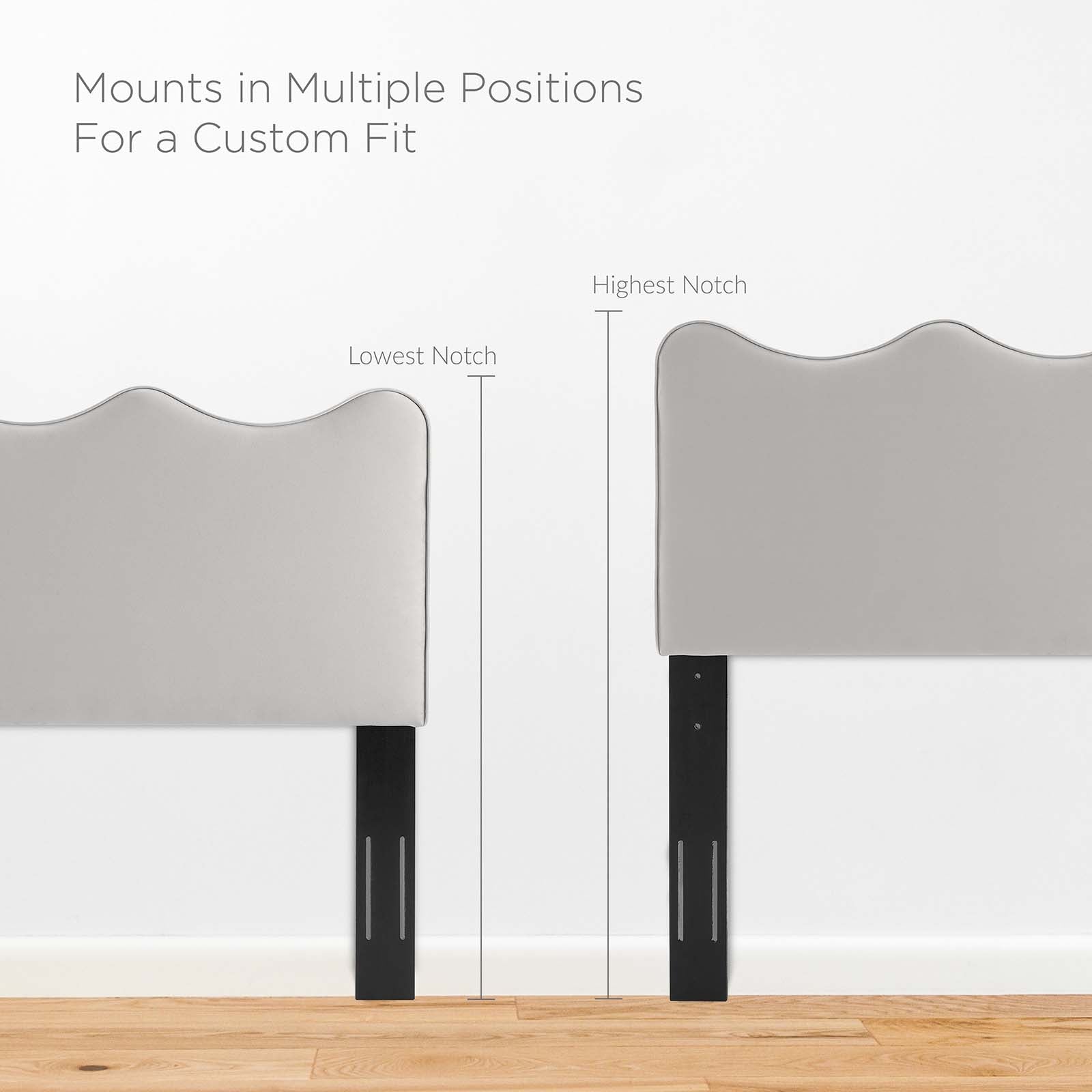 Incorporate the movement of the sea into your master bedroom or guest suite with the Athena Performance Velvet Full/Queen Headboard. Putting a modern twist on a classic scalloped design, this full or queen sized headboard features luxe texture and a silhouette inspired by the ocean waves. Covered in stain-resistant performance velvet, this upholstered headboard is complete with dense foam padding to offer a supportive place to sit back and relax while watching TV, resting, or reading in bed. With a frame crafted from MDF and plywood, this adjustable headboard for queen or full bed frames has multiple mounting positions. Assembly required.