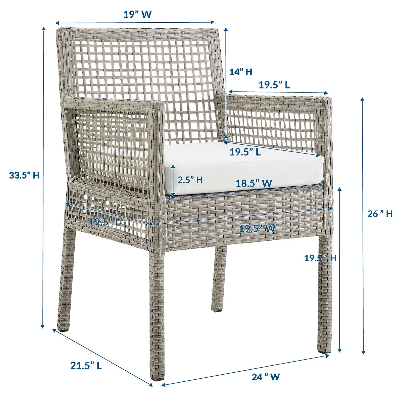 Available in sets of two or four, the Aura Outdoor Patio Dining Armchair is perfect for both intimate dinners and larger gatherings. With overall dimensions of 21.5" L x 24" W x 33.5" H, each chair is designed to provide ample space and support. The seat dimensions measure 19.5" L x 19.5" W x 19.5" H, and the armrests add an extra layer of comfort at 23" L x 21.5" W x 26" H. The backrest, measuring 19" W x 33.5" H, ensures you can sit back and relax in style, while the seat cushion dimensions of 19.5" L x 18.5" W x 2.5" H provide a plush seating experience.