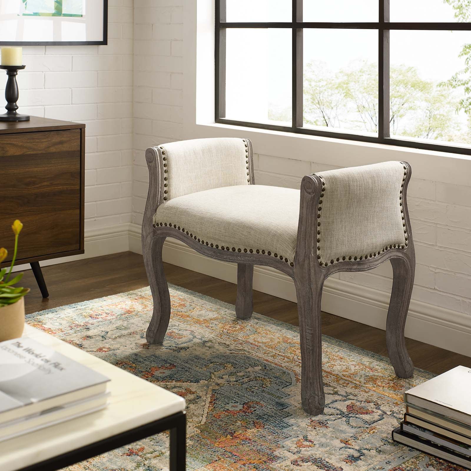 Blending vintage rustic charm with the elegance of French inspiration, the Avail Upholstered Bench is a beautiful addition to your home. Perfect in the bedroom, living room, or entryway foyer, this upholstered bench boasts timeless details that make a chic statement. Featuring nailhead trim, weathered wood cabriole legs, and sophisticated rolled armrests, this modern classic accent bench is upholstered in a soft and durable polyester fabric while dense foam padding creates a comfortable place to sit. Includes foot caps to protect flooring. Bench Weight Capacity: 300 lbs.