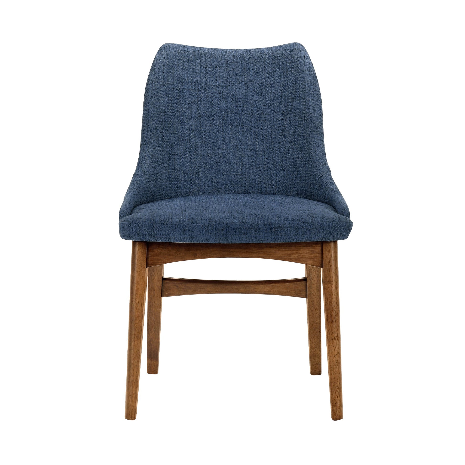 The Azalea Blue Fabric and Walnut Wood Dining Side Chairs from Armen Living are an exceptional choice to bring into the living area of your choice. The soft fabric upholstery is luxuriously wrapped around the entire seat - covering the ultra-comfortable foam padded cushion. Featuring a wide back and spacious seat, you never have to feel confined to a small space. The clean, sleek, and geometric wooden legs add a modern style to this chair - also assuring dependability that this chair will last and give you years of enjoyment. The contemporary look of the Azalea will update the decor in any dining room, bar, or lounge area, or wherever you decide to place it! The Azalea dining side chairs are available in your color choice of Gray fabric with black wood or blue, charcoal, or orange fabric with walnut wood. Product Dimensions: 21"W x 23"D x 33"H SH: 19"