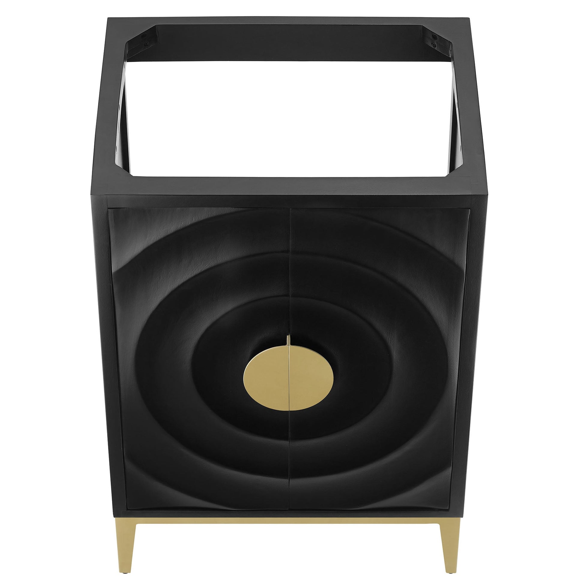 Refresh your bathroom's look with the Beau Wood 24” Bathroom Vanity, combining modern design with a classic sense of style. Made from solid wood, it offers both durability and a rich texture that complements any decor. Featuring an eye-catching design with concentric circles that draw the eye inward to a chic, brass-like metal cabinet pulls, this single bathroom vanity pairs classic elegance with contemporary flair. Standing on tapered legs that match the pulls, the Beau wood bathroom vanity creates a cohesive and sophisticated look. Inside, an adjustable shelf cleverly uses the available space while accommodating plumbing with its thoughtful cut-out design. Ideal for those who prefer to personalize their space, this cabinet vanity comes without a basin, allowing you to choose the perfect top. Whether it’s for a compact or more spacious bathroom, Beau blends aesthetic charm with everyday usability making it a smart yet fashionable choice for modern living. Assembly required. Sink basin not included. Overall Product Dimensions: 17.83"L x 23.39"W x 34.25"H