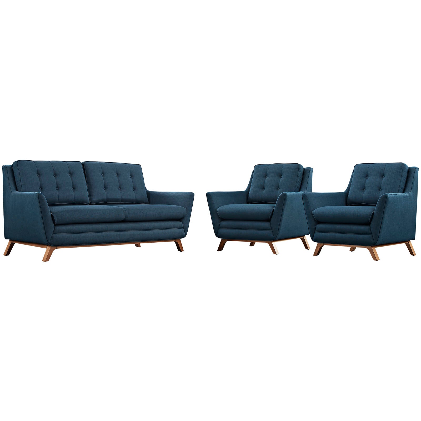 Dominate your décor with the expertly designed Beguile Collection. Exquisitely crafted with gently sloping arms, comfortable plush seat cushions, and adeptly tufted back cushion buttons, Beguile is a delightful collection that reinvents mid-century style. Outfitted with a solid wood walnut-stained base and fine fabric, Beguile comes perfect for living room, lounge and meeting areas.