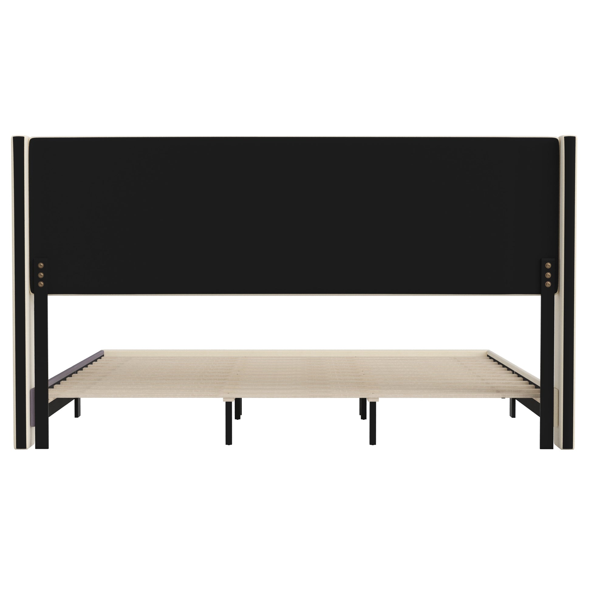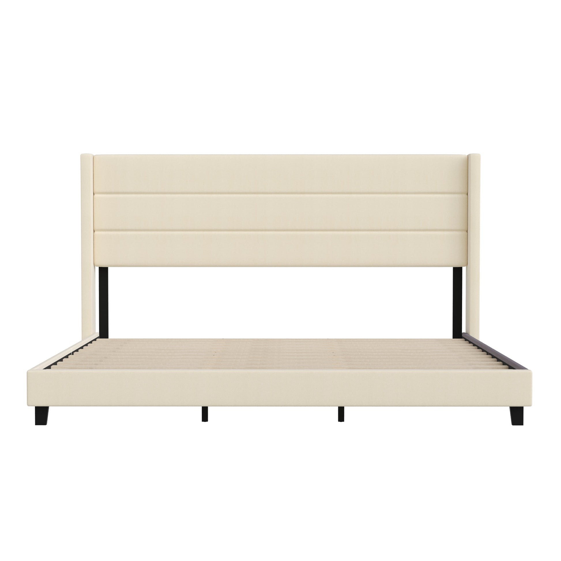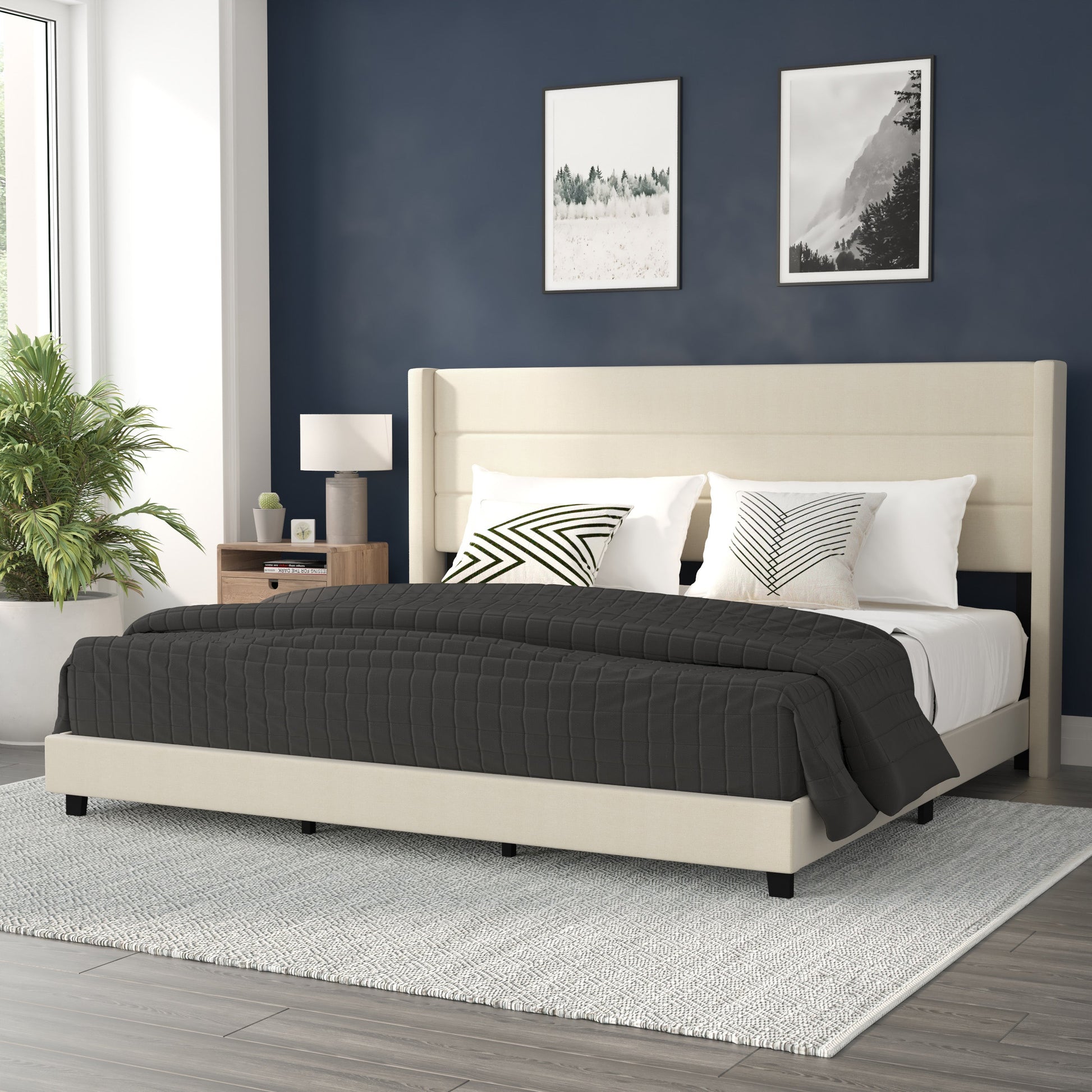 Hollis King Upholstered Platform Bed with Wingback Headboard, Mattress Foundation with Slatted Supports, No Box Spring Needed, Beige Faux Linen Dimensions: 84"W x 81"D x 47"H