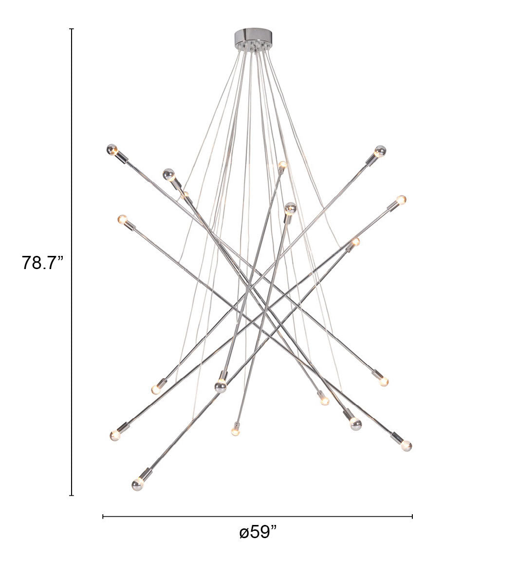 Belief ceiling lamp gives a eye caching statement to any room, with long chrome arms suspended is a elegant criss cross pattern and finished at either end with half chrome bulbs. This modern design will stun and amaze guests in residential or commercial entry ways, stairwells and any vaulted ceiling. Max Watt 25 W, Size E12, Type G45. UL approved and listed. Bulbs are included.