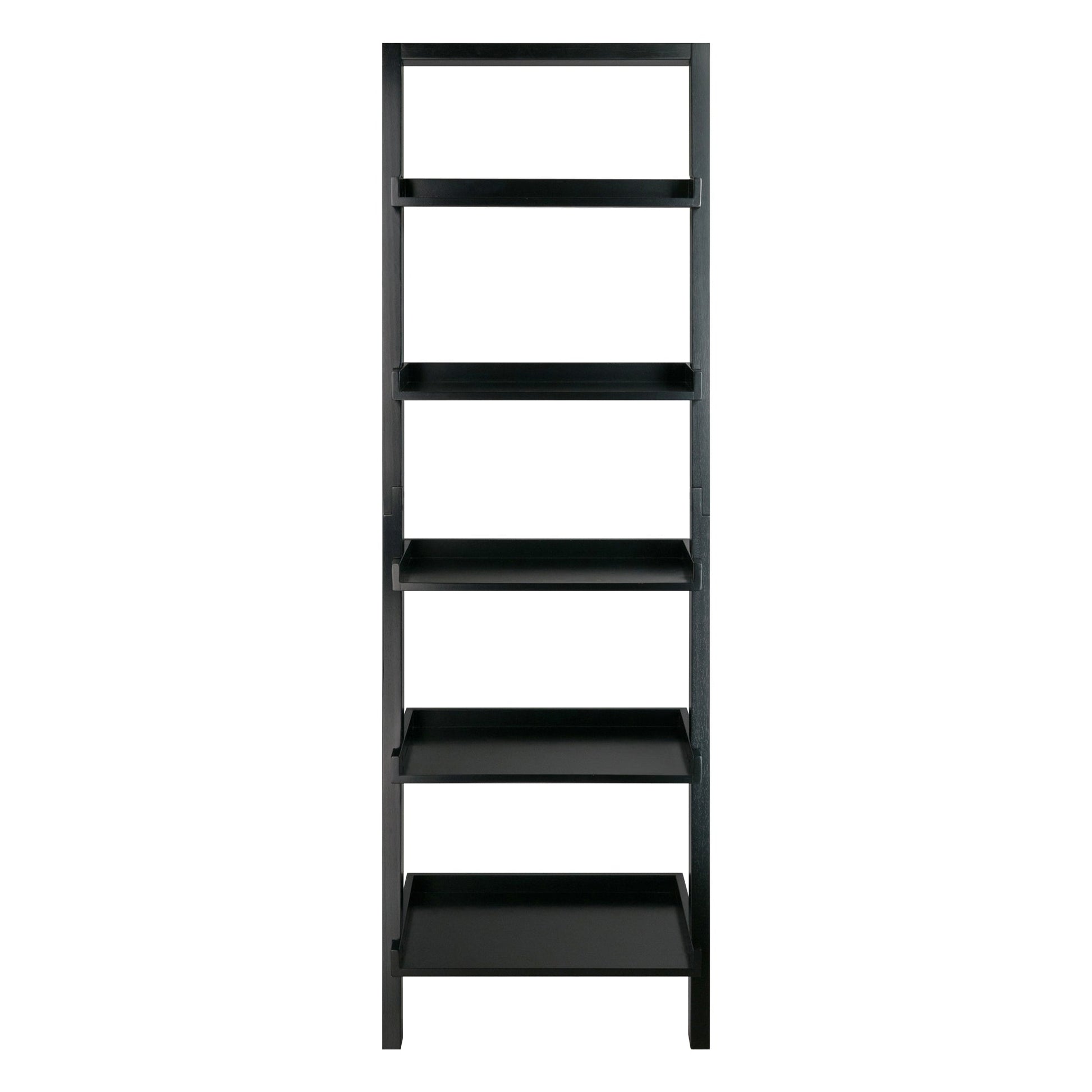 The Winsome Wood Bellamy Leaning Shelf is a crisp and stylish space-saver that combines modern design with a range of capabilities. Finished in a sleek Black, this trendy design blends with most decor and the and slim structure allow it to fit into tight spaces. The back side will sit flush against a wall while the front of the ladder-style bookcase slants outward towards the bottom. The shelves decrease in size towards the top making it resemble a ladder and exude an aesthetic visual appeal. Ideal for apartment living or smaller rooms, this space-saving unit features 5-tiers of open shelves providing plenty of room to organize your workspace, display books or showcase family photos. The side and back railings on the shelves ensure your items stay in place. Use as a stand-alone piece or paired with the Winsome Bellamy Leaning Desk or Storage Shelf to create even more storage and display options in a modular fashion (each sold separately). Conveniently packed and shipped in 1 box, that includes the hardware necessary for assembling along with the tip resistant kit to keep the unit securely attached to the wall. Replacement part request can be submitted directly to the manufacturer within 60 days from date of purchase.