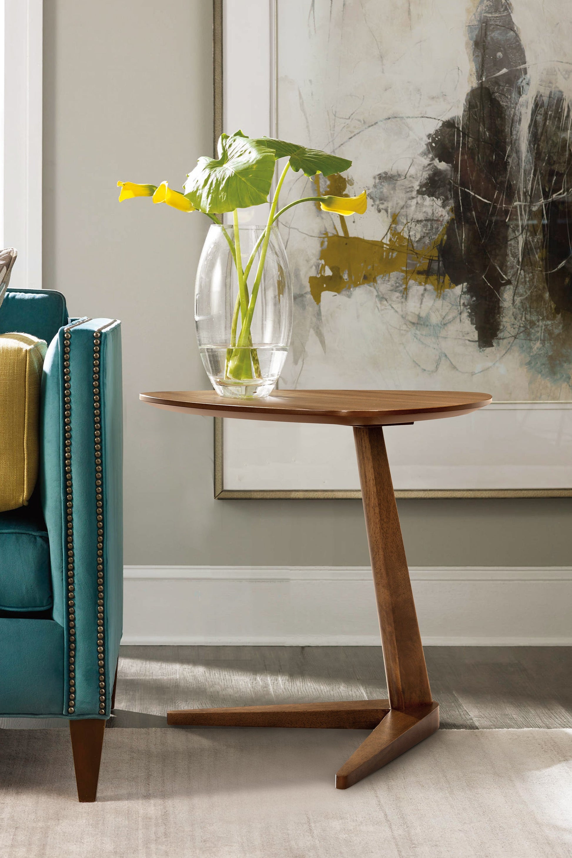 The Bianka Walnut Veneer Tea Table from Armen Living is a unique design that offers the utmost quality for our customers and your home. Place a hot cup of coffee, your favorite book, or even an ornamental or decorative accent - this table can suit all of your needs. This tea table stands on top of a long neck and a supportive v-shaped table base - this design was made to wow! The rich wood grain will add a striking element to your home and living area. Product Dimensions: 19"W x 19"D x 19"H