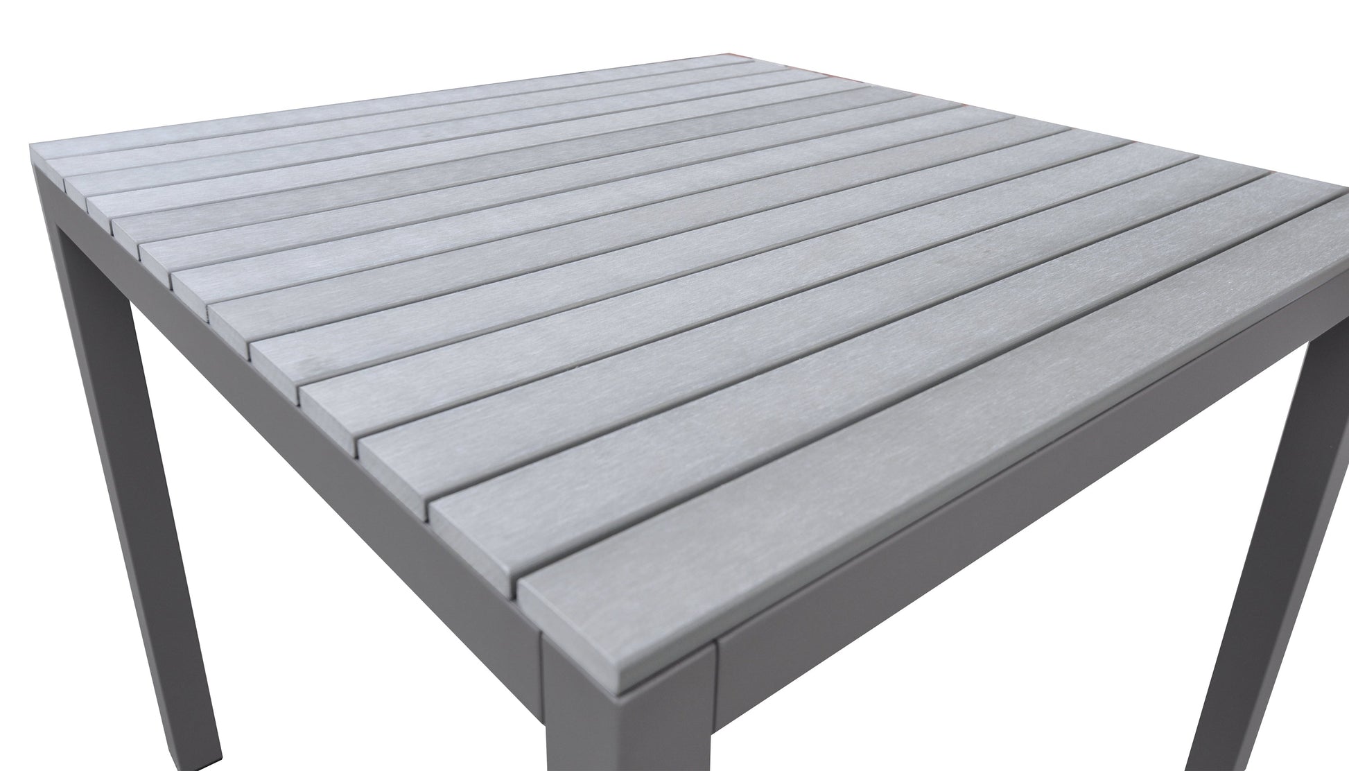 The Armen Living Bistro contemporary outdoor set is the perfect choice for any modern patio seating arrangement. This beautiful set features 4 gray powder coated aluminum chairs and 1 sleek gray powder coated aluminum dining table. The Bistro chairs sport a unique waterproof gray sling textilene seat and back, resonating style without adding additional weight to the easy to carry pieces. The Bistro table is topped by a stylish gray wood paneled top that accentuates that modernity of the collection. The Bistro patio set is available in a gray powder coated finish.