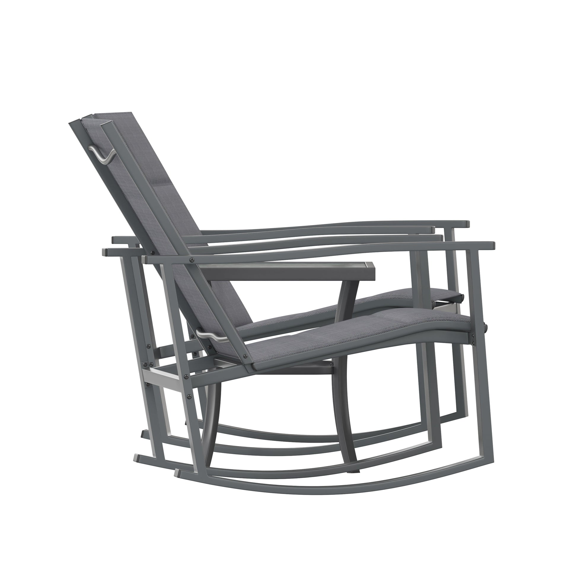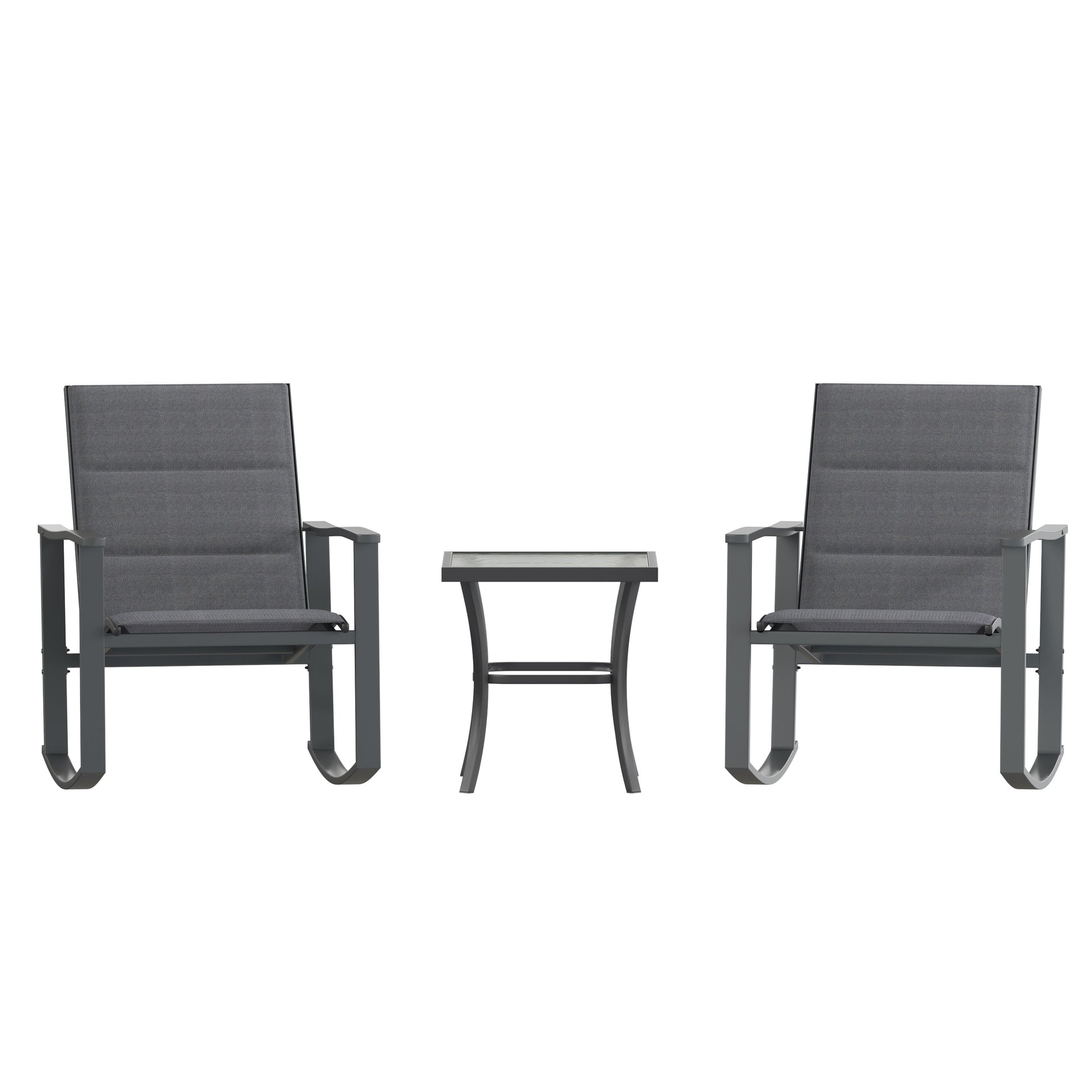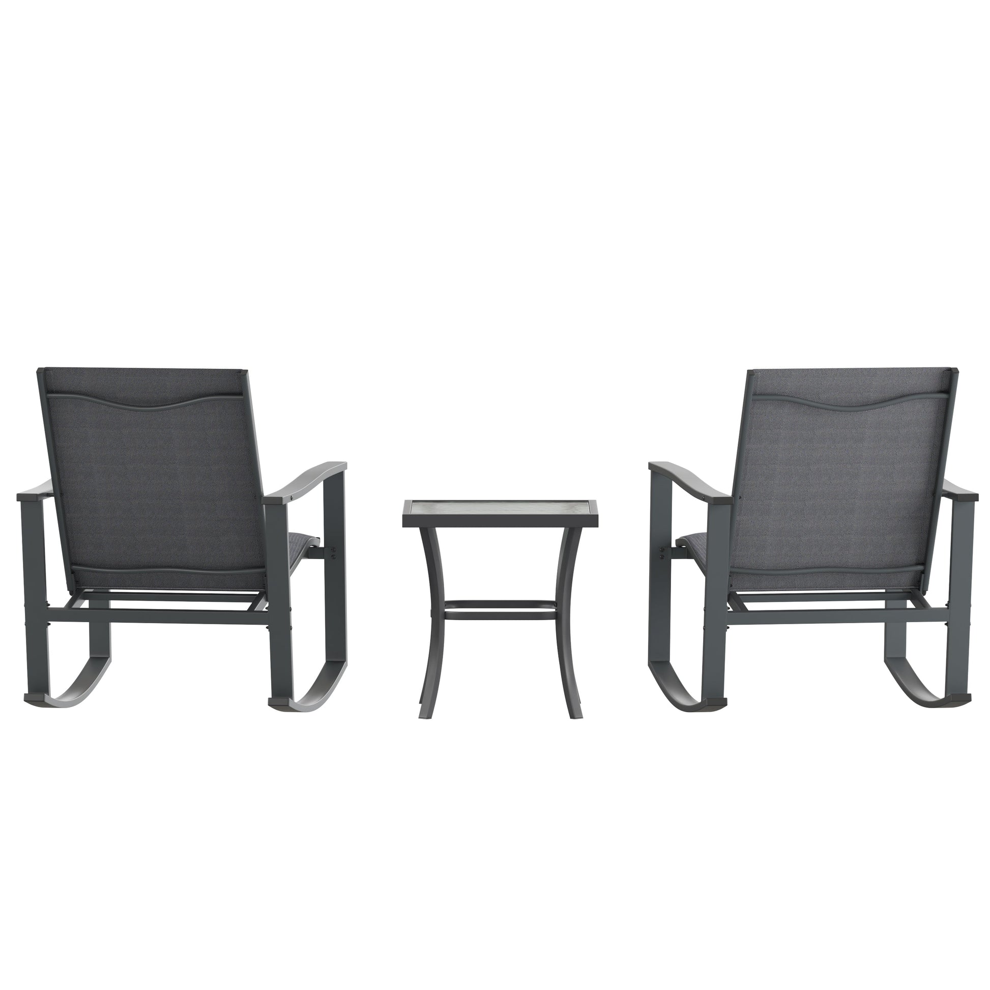 Brazos 3 Piece Outdoor Rocking Chair Bistro Set with Flex Comfort Material and Steel Framed Glass Top Table, Black/Black Dimensions: 23.75"W x 31"D x 32"H